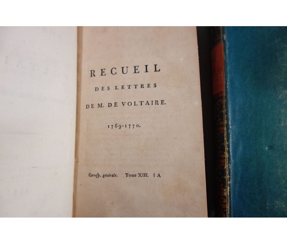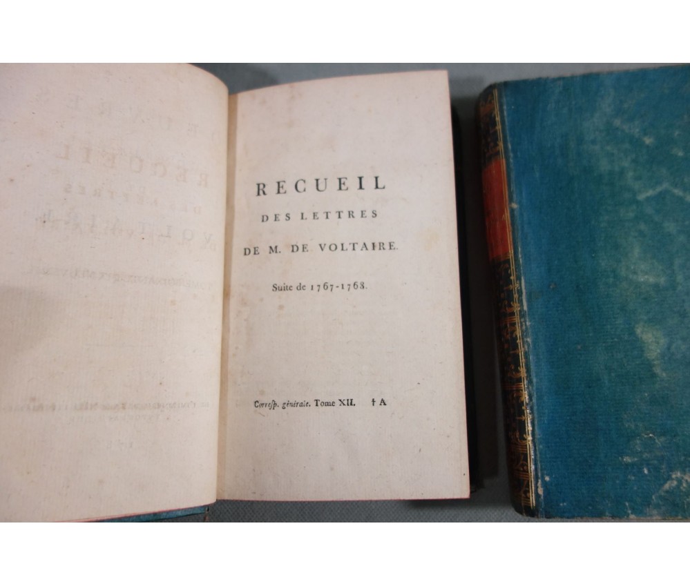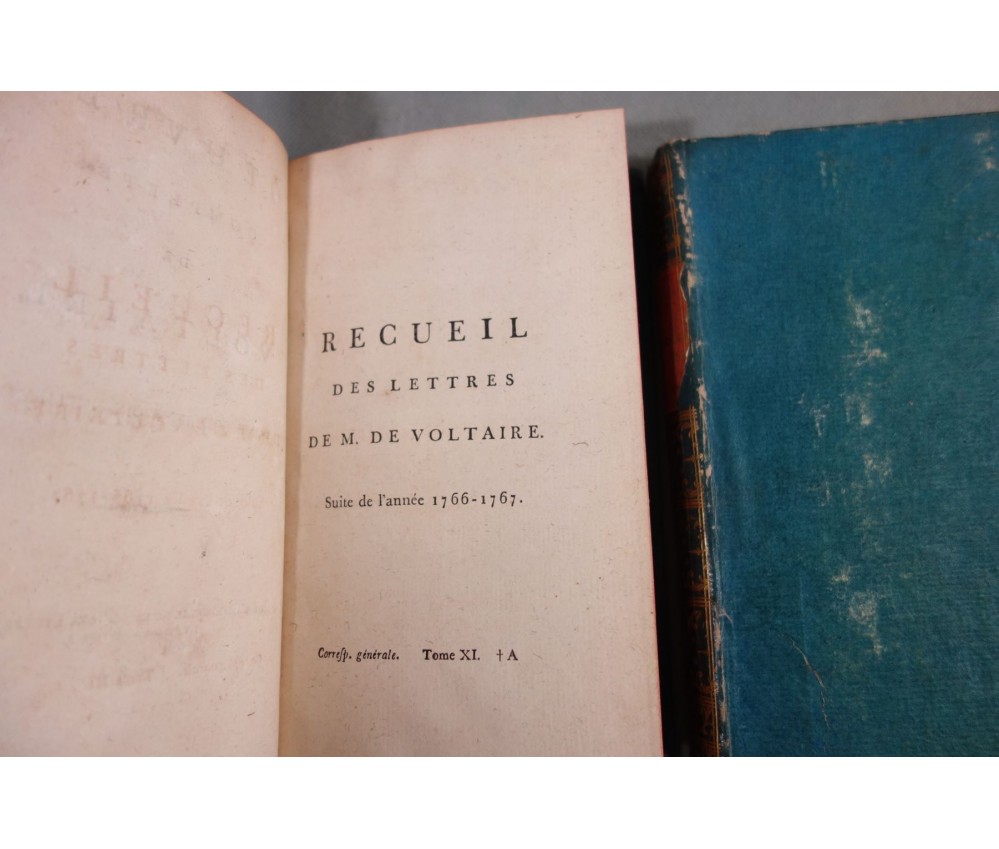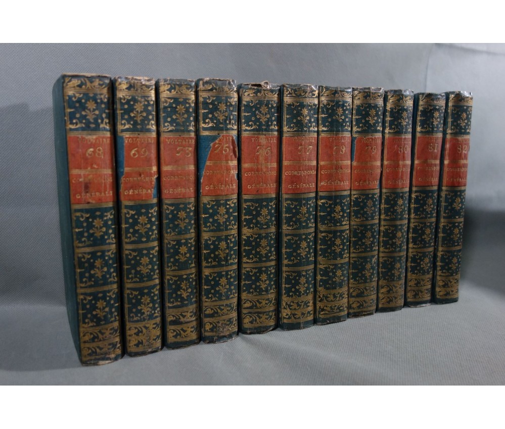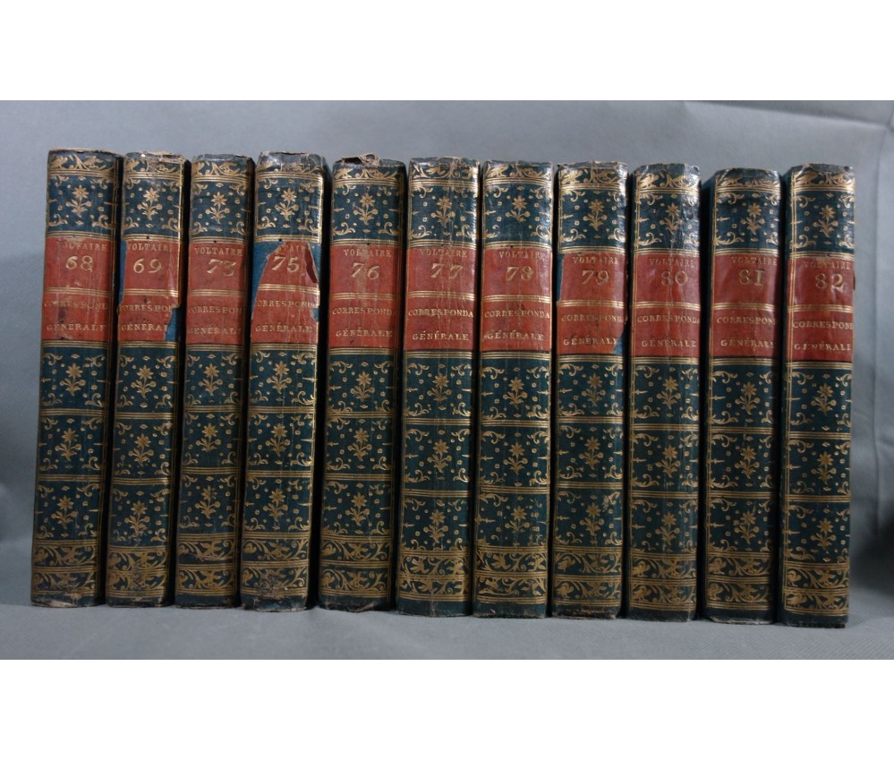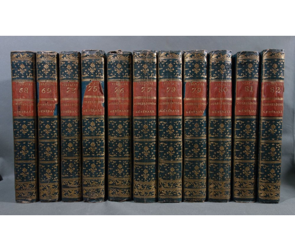 Voir nos visuels, rares et beaux exemplaires bien reliés, ensemble incomplet de la correspondance inédite (faisant partie des oeuvres complètes de Voltaire en 92 volumes, cf. BRUNET V-1353, Cette édition célèbre était la plus complète et la mieux ordonnée... on y a donnée pour la 1ère fois la volumineuse correspondance de l'auteur...). Ici sont vendu 11 volumes de lettres soit une bonne partie de l'immense correspondance (estimée à 15 000 lettres), correspondants innombrables et de tous bords, gens de lettres, nobles, dirigeants. (Edition de Khel) de l'imprimerie de la Société Littéraire Typographique, 1785. 11 petits In-8, jolies reliures demi-cuir bleues d'époque (usures des coins et coiffes, rides, frottements aux plats), dos lisses richement ornés, pièces de titres rouges (3 avec manque), intérieur sur papier vergé, plus ou moins jauni, taches et brunissures. Nombreux livres anciens et rares à découvrir dans notre librairie. Envoi rapide et soigné! (F10)