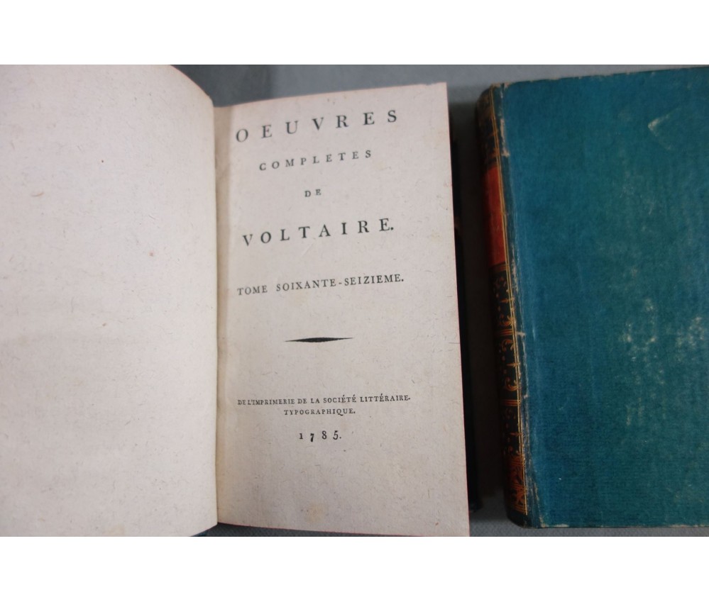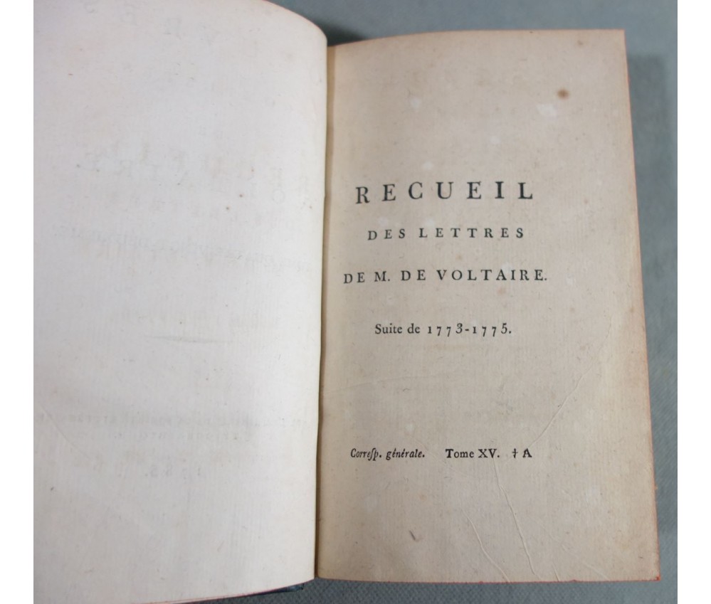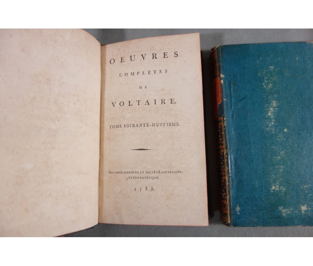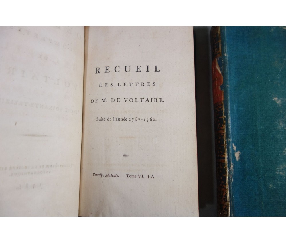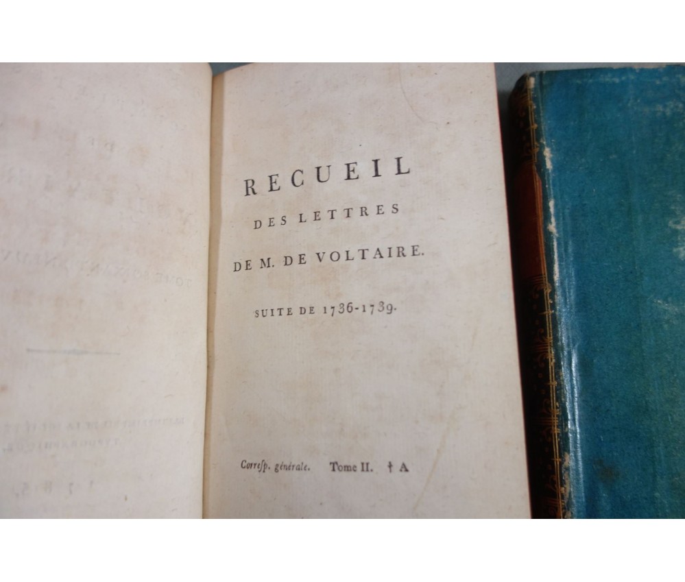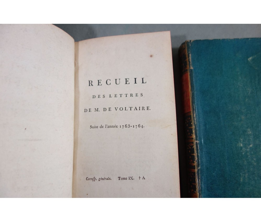 Voir nos visuels, rares et beaux exemplaires bien reliés, ensemble incomplet de la correspondance inédite (faisant partie des oeuvres complètes de Voltaire en 92 volumes, cf. BRUNET V-1353, Cette édition célèbre était la plus complète et la mieux ordonnée... on y a donnée pour la 1ère fois la volumineuse correspondance de l'auteur...). Ici sont vendu 11 volumes de lettres soit une bonne partie de l'immense correspondance (estimée à 15 000 lettres), correspondants innombrables et de tous bords, gens de lettres, nobles, dirigeants. (Edition de Khel) de l'imprimerie de la Société Littéraire Typographique, 1785. 11 petits In-8, jolies reliures demi-cuir bleues d'époque (usures des coins et coiffes, rides, frottements aux plats), dos lisses richement ornés, pièces de titres rouges (3 avec manque), intérieur sur papier vergé, plus ou moins jauni, taches et brunissures. Nombreux livres anciens et rares à découvrir dans notre librairie. Envoi rapide et soigné! (F10)