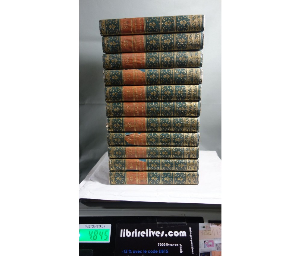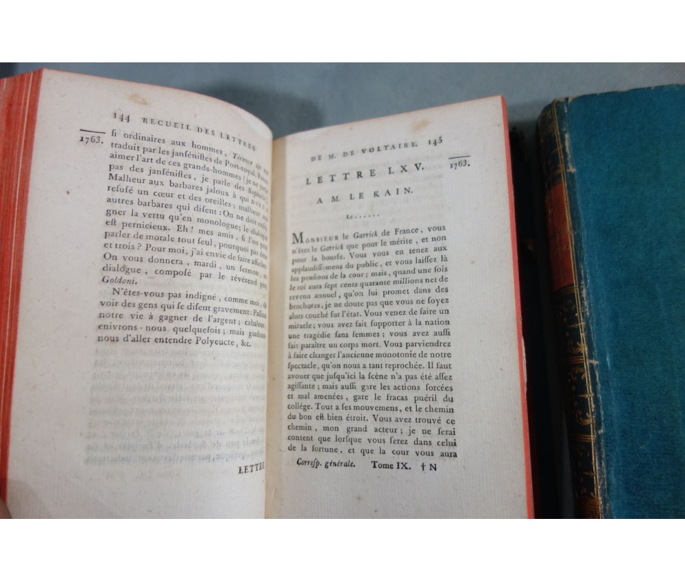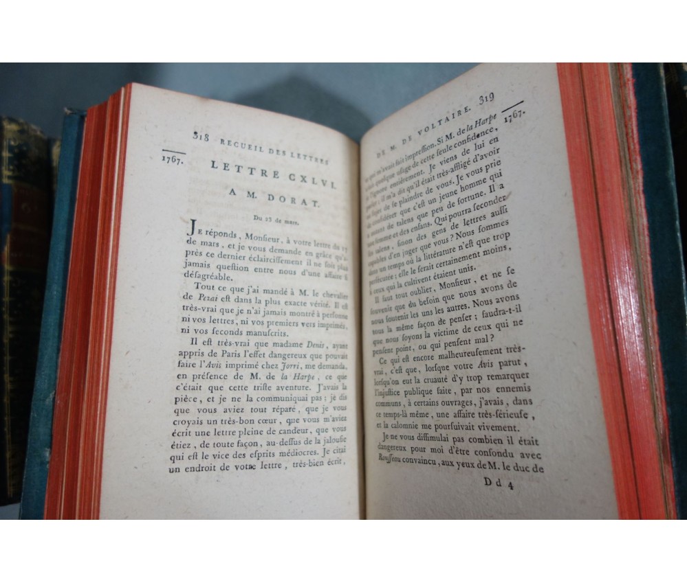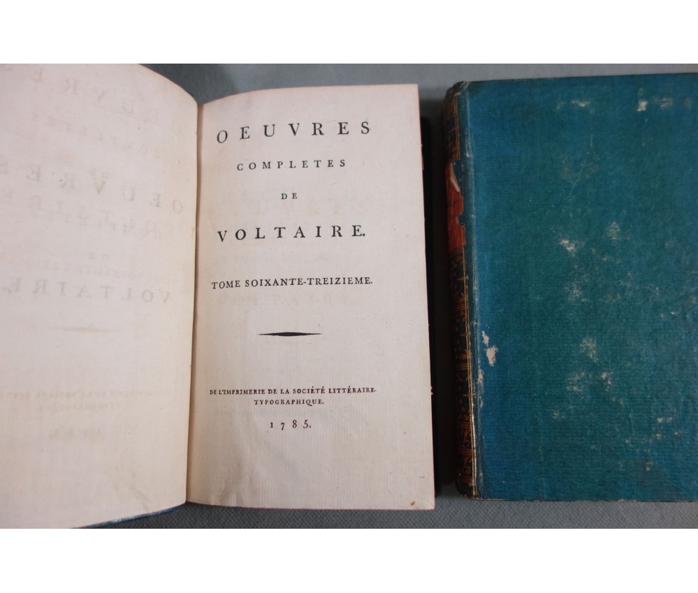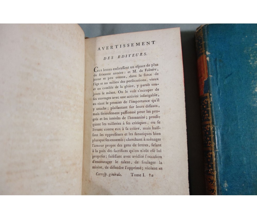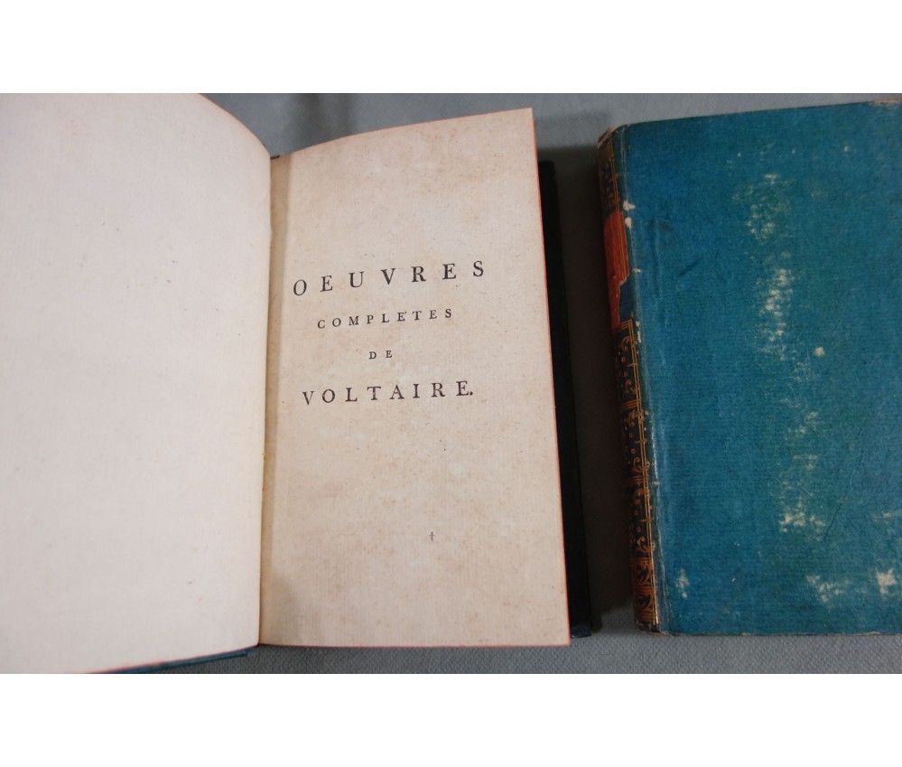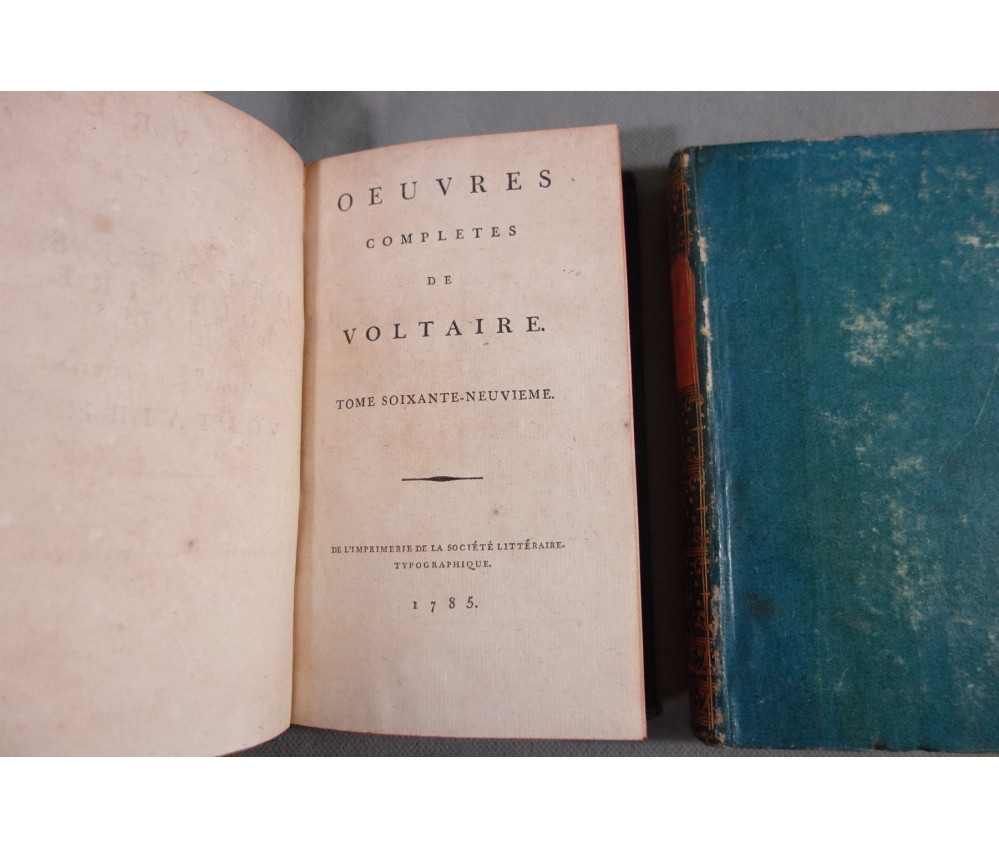 Voir nos visuels, rares et beaux exemplaires bien reliés, ensemble incomplet de la correspondance inédite (faisant partie des oeuvres complètes de Voltaire en 92 volumes, cf. BRUNET V-1353, Cette édition célèbre était la plus complète et la mieux ordonnée... on y a donnée pour la 1ère fois la volumineuse correspondance de l'auteur...). Ici sont vendu 11 volumes de lettres soit une bonne partie de l'immense correspondance (estimée à 15 000 lettres), correspondants innombrables et de tous bords, gens de lettres, nobles, dirigeants. (Edition de Khel) de l'imprimerie de la Société Littéraire Typographique, 1785. 11 petits In-8, jolies reliures demi-cuir bleues d'époque (usures des coins et coiffes, rides, frottements aux plats), dos lisses richement ornés, pièces de titres rouges (3 avec manque), intérieur sur papier vergé, plus ou moins jauni, taches et brunissures. Nombreux livres anciens et rares à découvrir dans notre librairie. Envoi rapide et soigné! (F10)