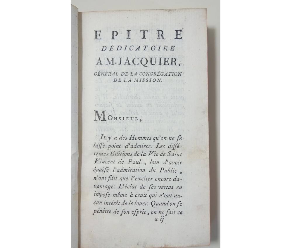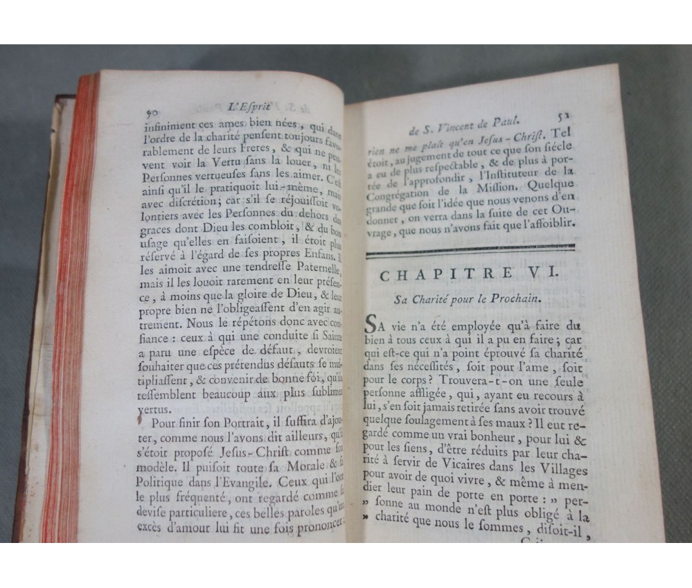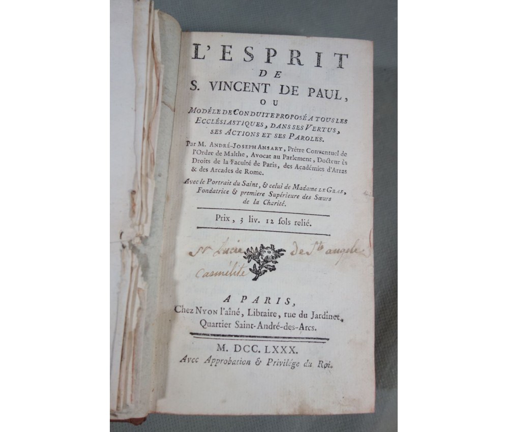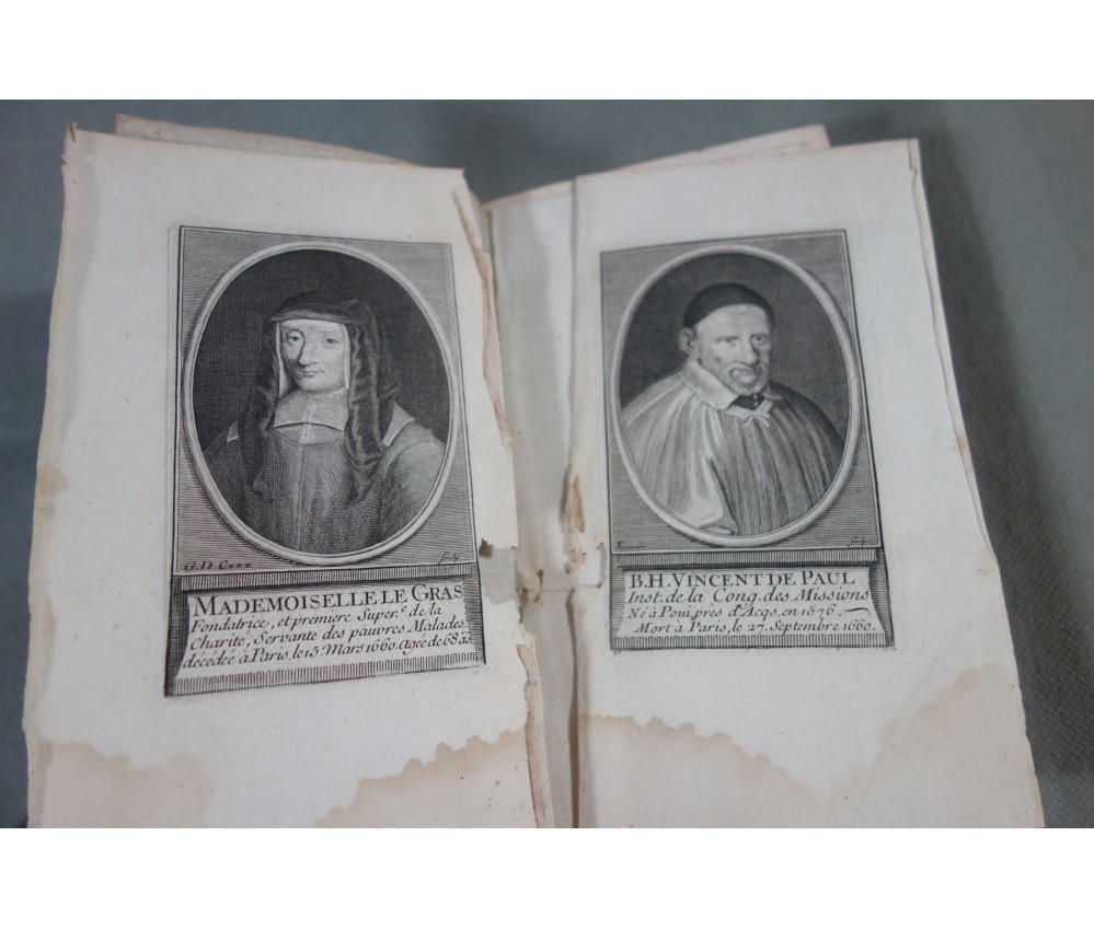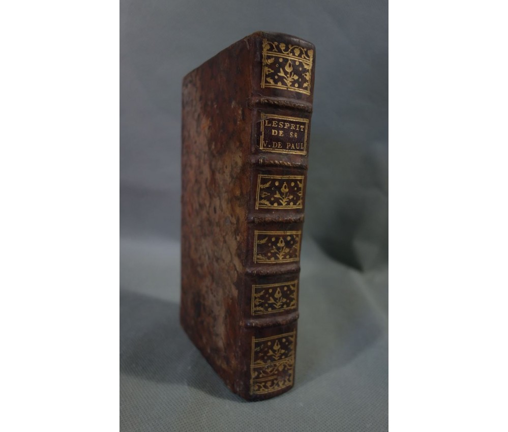 Voir nos visuels, édition originale, Paris, Chez Nyon l'ainé, Imp. Cl. Simon, 531 pages, 1780. Avec Approbations et privilèges du roi. 2 portraits en frontispice (détachés, mouillure, manque de papier); In-12, reliure plein cuir (frottée, usures des bords et coins), dos à 5 nerfs, caissons ornés, tranches rouges, intérieur bien blanc, rares rousseurs. Bon et rare exemplaire. Envoi soigné! (b22) L'Esprit de S. Vincent de Paul, ou Modèle de conduite proposé à tous les ecclésiastiques, dans ses vertus, ses actions et ses paroles