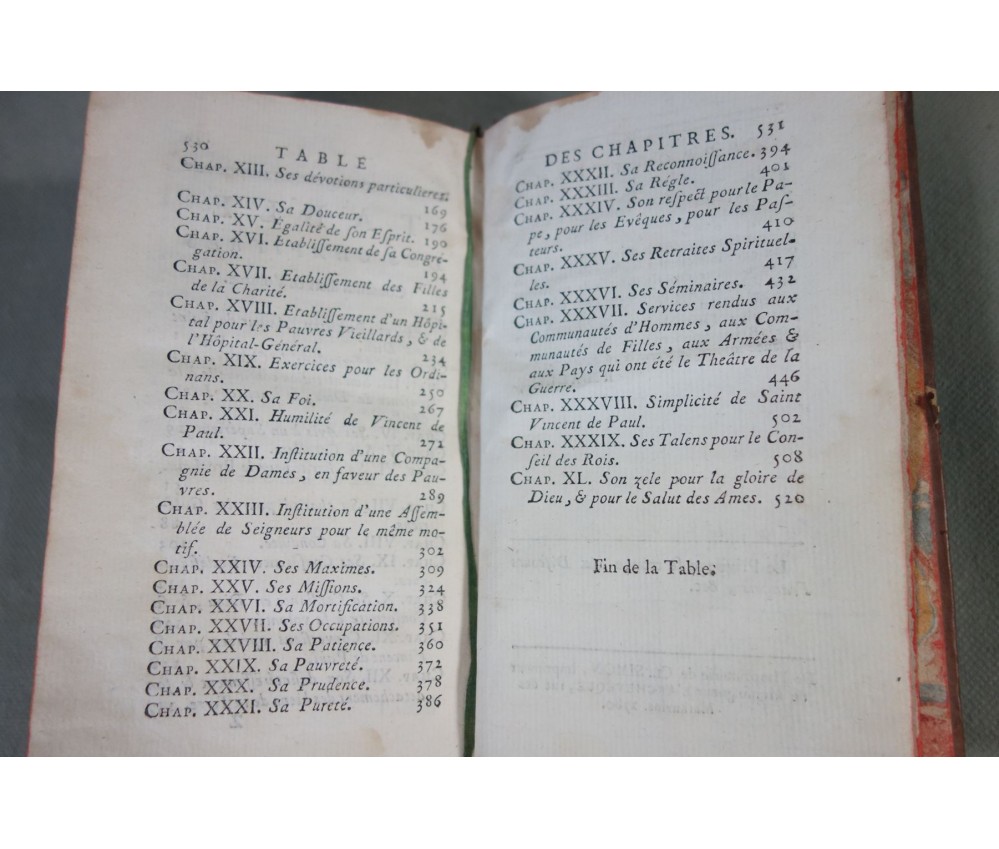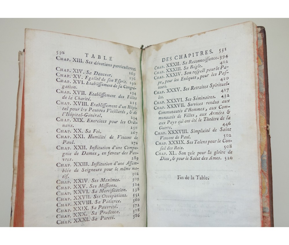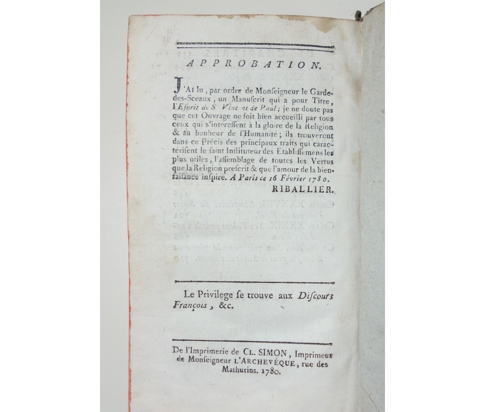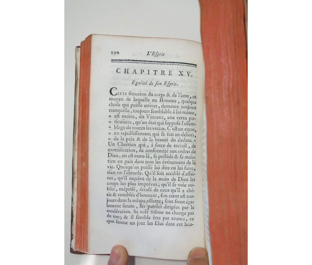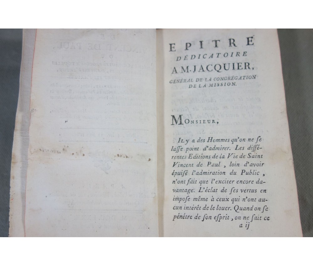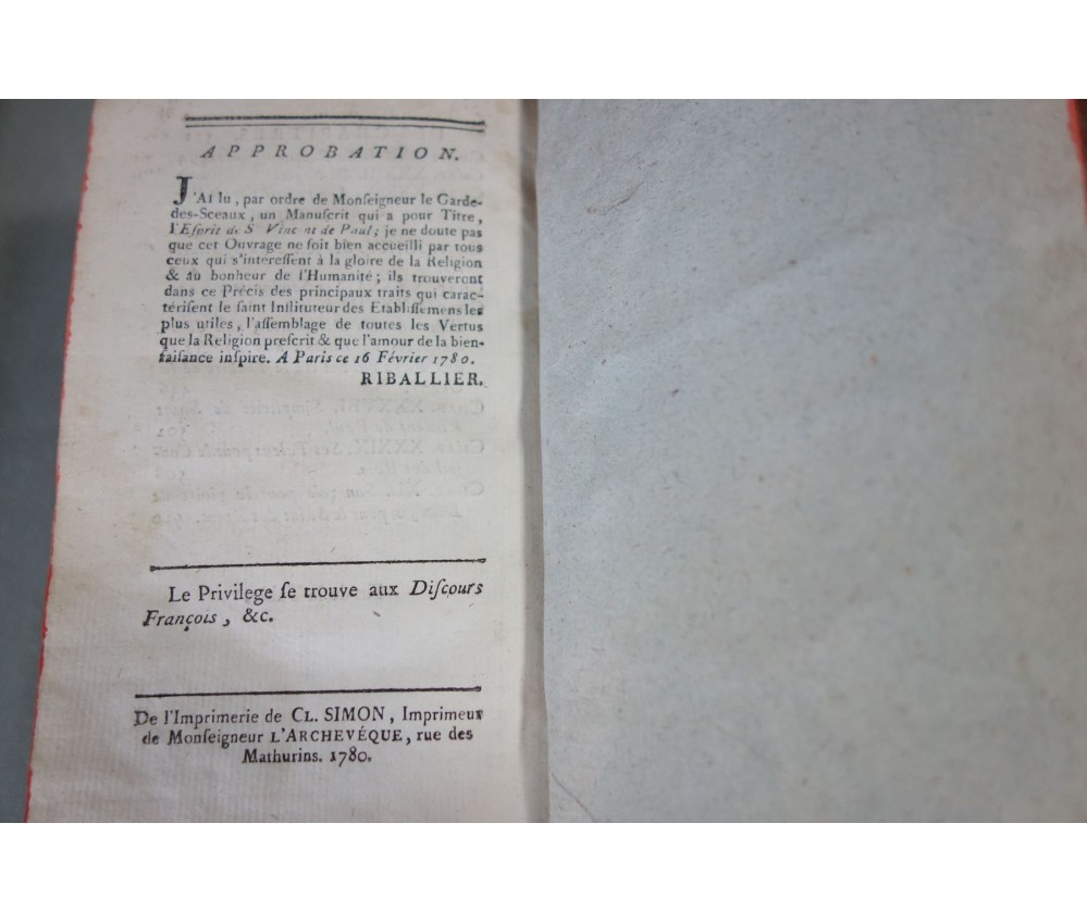 Voir nos visuels, édition originale, Paris, Chez Nyon l'ainé, Imp. Cl. Simon, 531 pages, 1780. Avec Approbations et privilèges du roi. 2 portraits en frontispice (détachés, mouillure, manque de papier); In-12, reliure plein cuir (frottée, usures des bords et coins), dos à 5 nerfs, caissons ornés, tranches rouges, intérieur bien blanc, rares rousseurs. Bon et rare exemplaire. Envoi soigné! (b22) L'Esprit de S. Vincent de Paul, ou Modèle de conduite proposé à tous les ecclésiastiques, dans ses vertus, ses actions et ses paroles