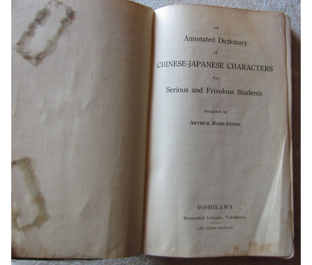 Ed. Yoshikawa, 257 pages, sans date. Dictionnaire chinois-japonais avec traduction anglaise, broché, en bon état, couverture toilée souple, intérieur propre mais jauni, avec sa jaquette transparente d'origine usée. Couverture usée sur les coiffes et dernière page usée. Envoi rapide et soigné!(V2)