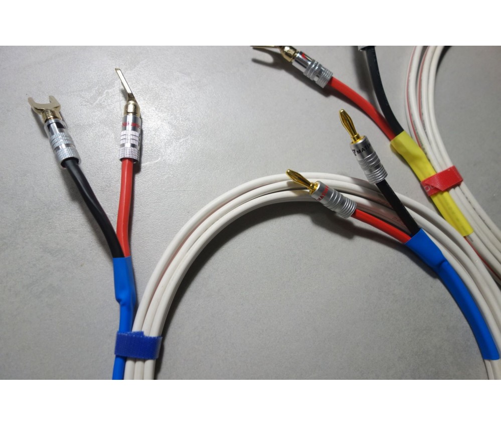 Montés avec d'excellents connecteurs banane côté ampli (cuivre plaqué or 24K) et des grandes fourches (pour les borniers standards). Excellentes fiches en cuivre plaquées or non magnétiques, robustes et très pratiques pour les amplis et enceintes modernes ou anciennes. Elle se fixent et se retirent aisément.