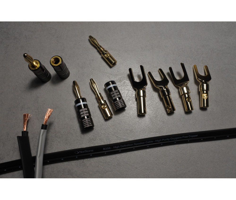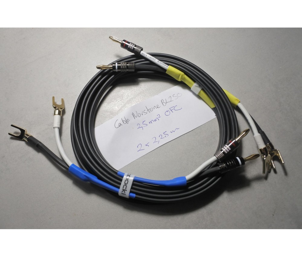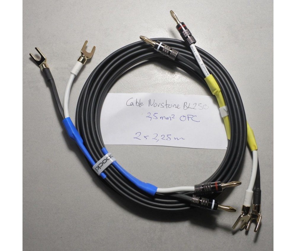 Câbles haut-parleur / enceintes / speaker montés 2 x 2,25 m - Norstone 2,5 mm2 OFC - B250 High Definition Speaker Cable - High Purity Oxygene Free Copper + 4 fiches banane + 4 fourches plaquées or