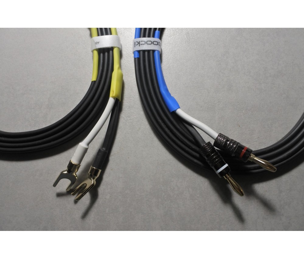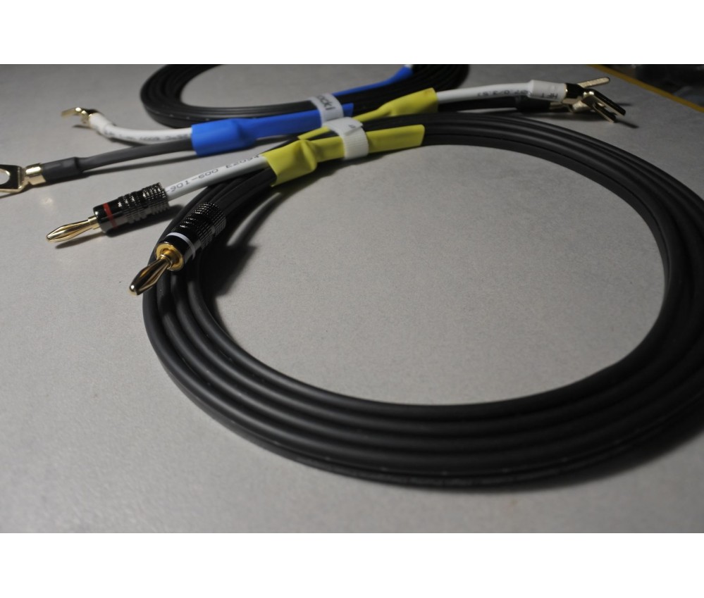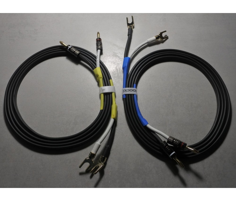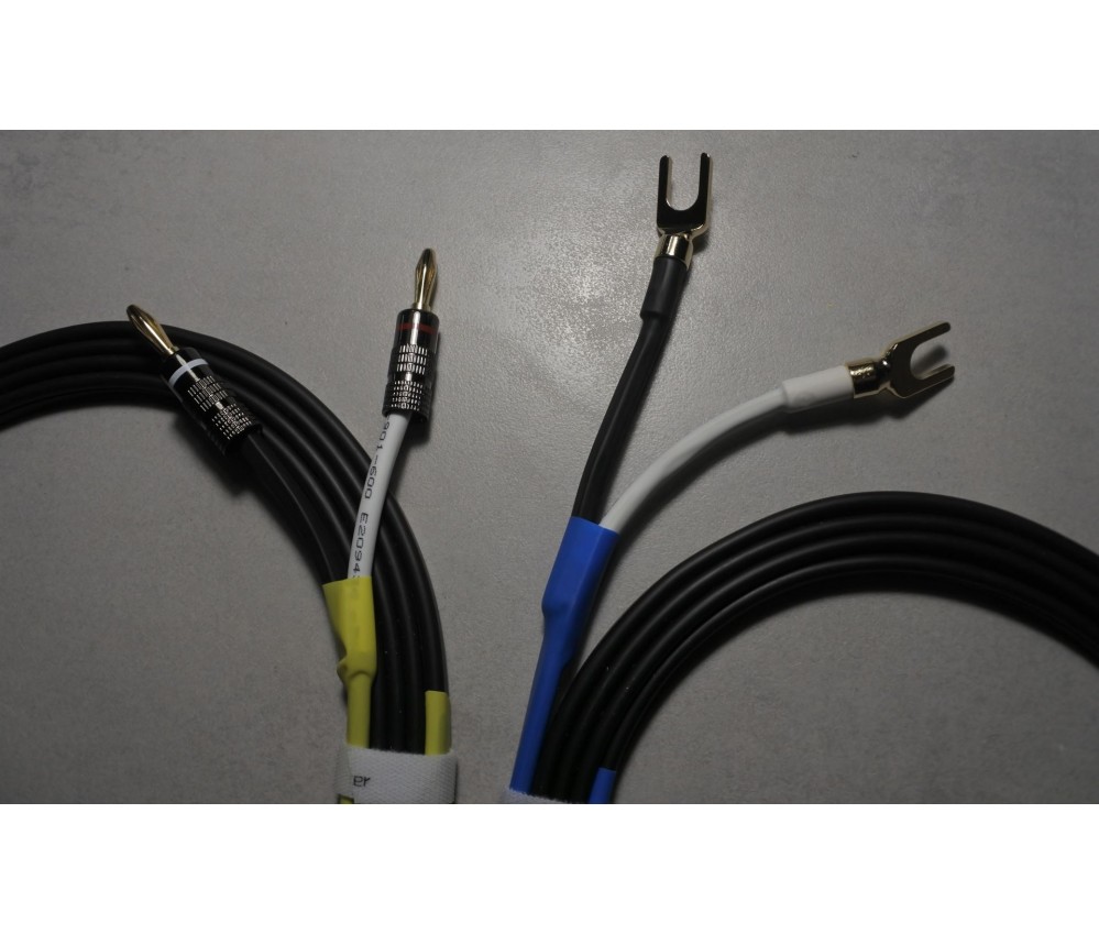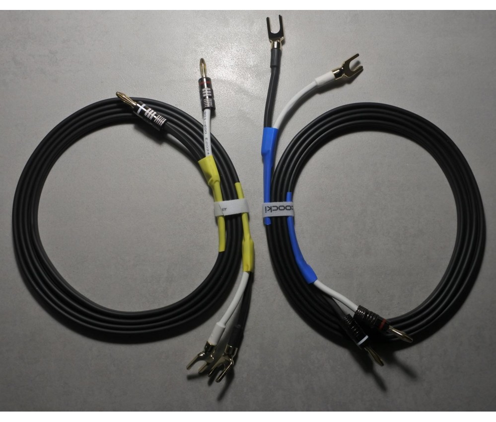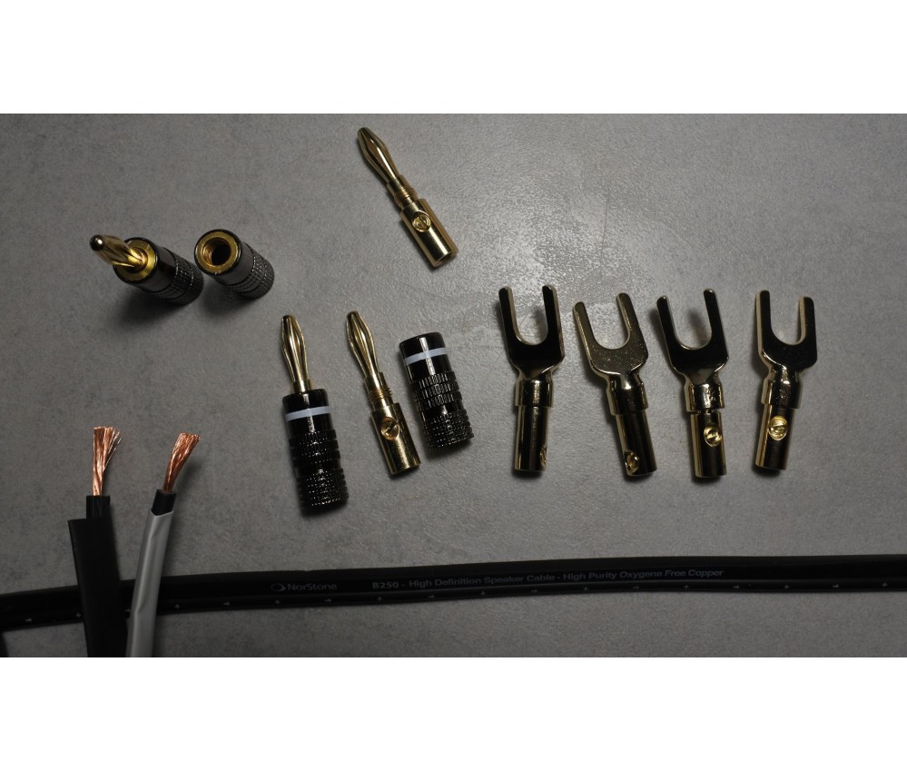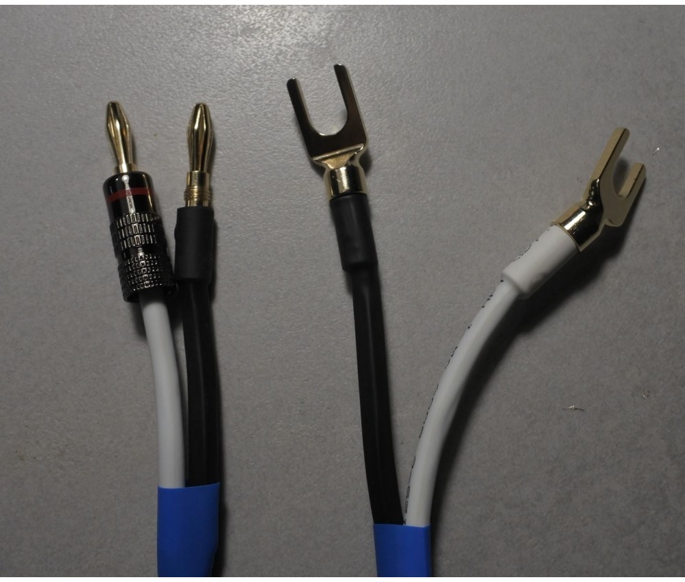 Montés avec d'excellents connecteurs banane et des grandes fourches (pour les borniers standards). Excellentes fiches en cuivre plaquées or non magnétiques, bagues en alu, robustes et très pratiques pour les amplis et enceintes modernes ou anciennes. Elle se fixent et se retirent aisément.