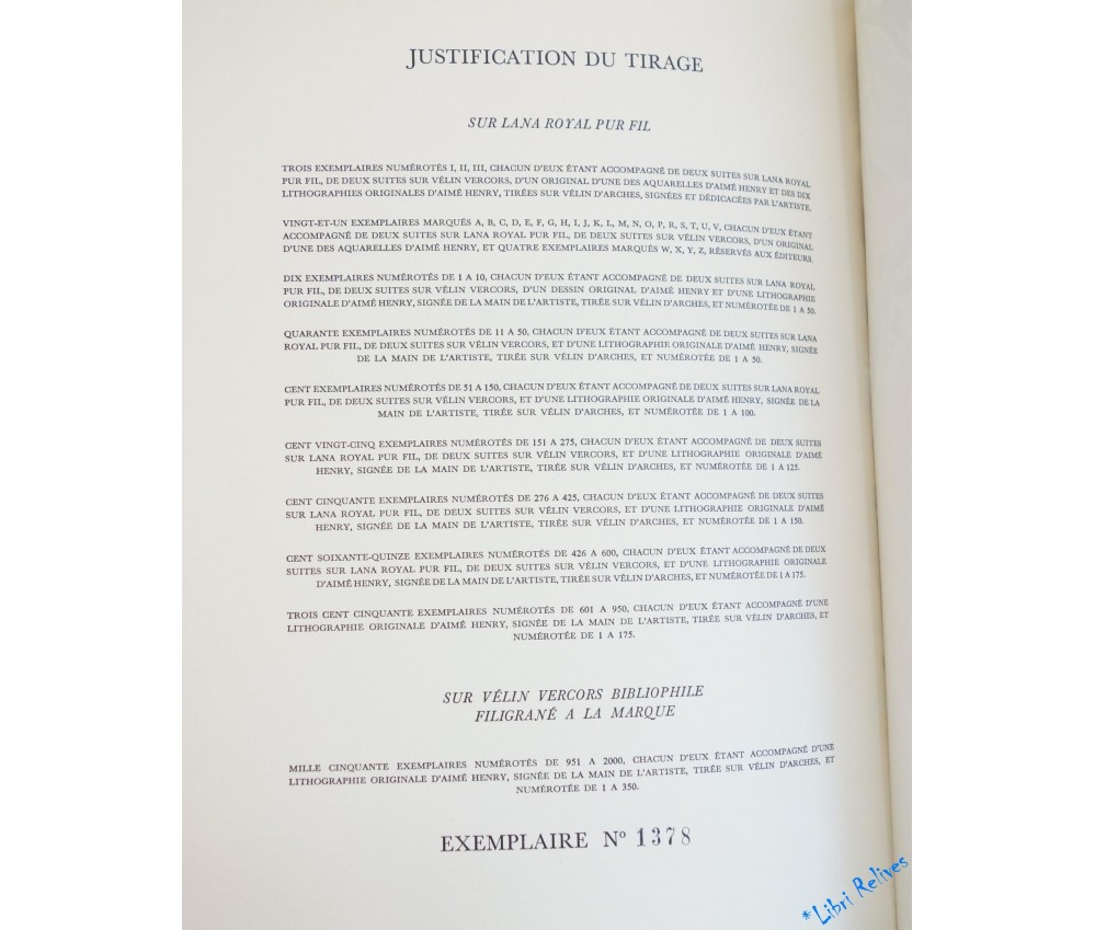 Voir nos visuels, 2 volumes, complet, un des 1050 exemplaires numérotés sur vélin Vercors (tirage limité à 2000), Nouvelle Librairie de France, 351+405 pages, 1979. Superbes compositions originales en pleine page de Aimé HENRY. Forts in-4, reliure pleine peau à 6 nerfs (légère usure de certains coins), plats ornés de l'autographe de l'auteur, gardes moirées, tranche de tête dorée, intérieurs frais. Très bel ensemble. Envoi rapide et soigné! (F32)