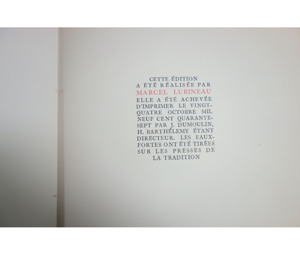 Voir nos visuels, bon et rare exemplaire, 20 superbes illustrations originales en couleurs de Bécat dont 6 hors-texte (collationnées), tirées sur les presses de La Tradition. Tirage numéroté, limité à 500 exemplaires, 1 des 400 sur vélin de Lana à la forme. Le Vasseur et Cie, 1947. Fort In-4, sans l'étui, couverture rempliée (découpage en coin inférieur, taches), en feuilles, beau papier, propre, quelques rousseurs et petite mouillure en coin inférieur sur les derniers feuillets. Nombreux livres rares et illustrés modernes à découvrir dans notre librairie. Envoi rapide et soigné! (G12)