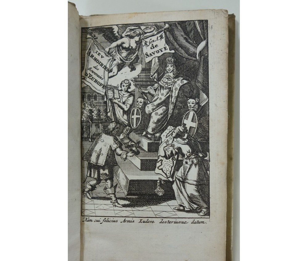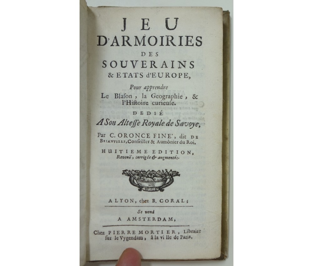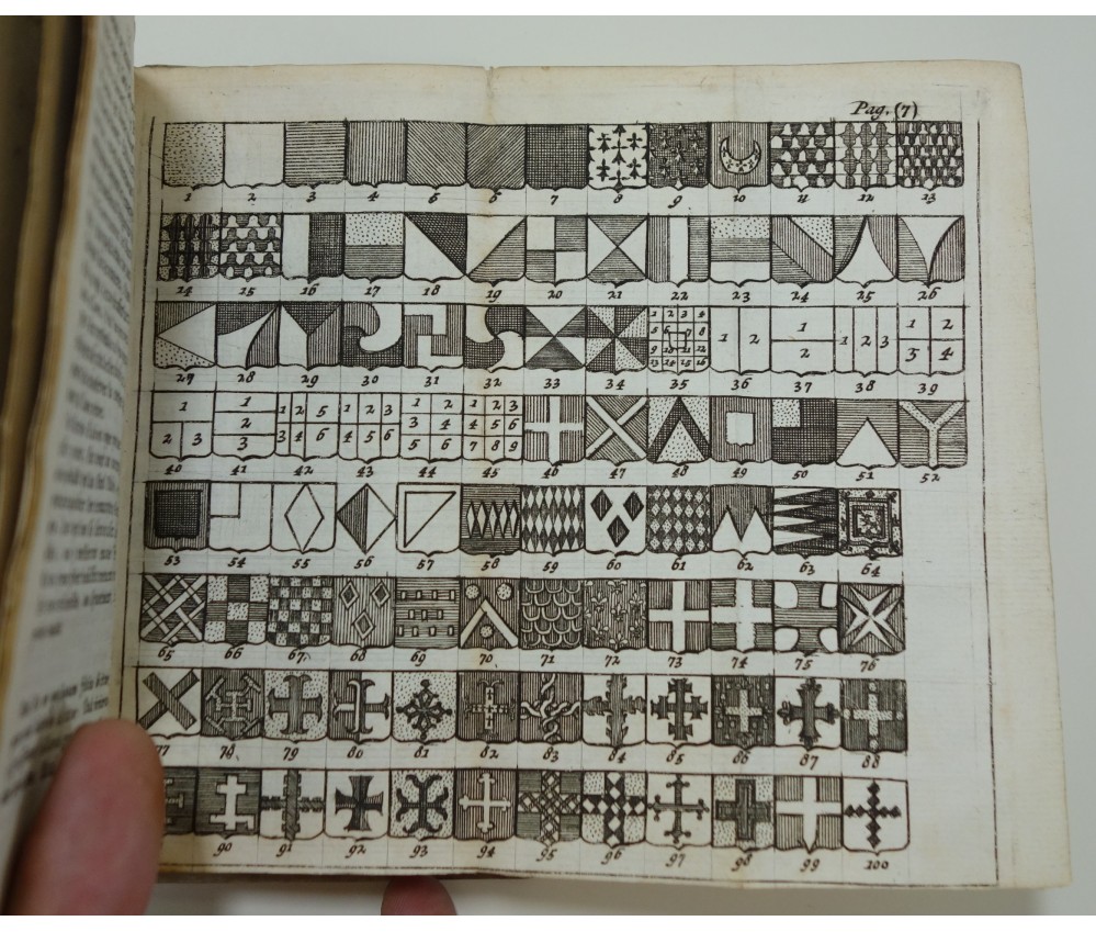 Voir nos visuels, A Lyon, chez B. Coral et A Amsterdam, Pierre Mortier, 180 pages, sans date (8ème édition revue, corrigée et augmentée, circa 1700). Avec un beau frontispice gravé dédié au Duc de Savoie et 1 planche dépliante de 100 blasons. In-12, belle reliure plein vélin ivoire (marques), dos lisse avec titre manuscrit, intérieur propre, dernière page marquée. Très rare et bel exemplaire bien relié. Envoi rapide et soigné ! (H8)