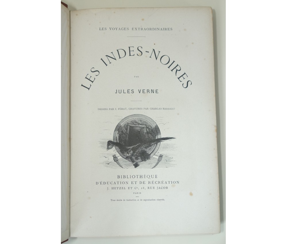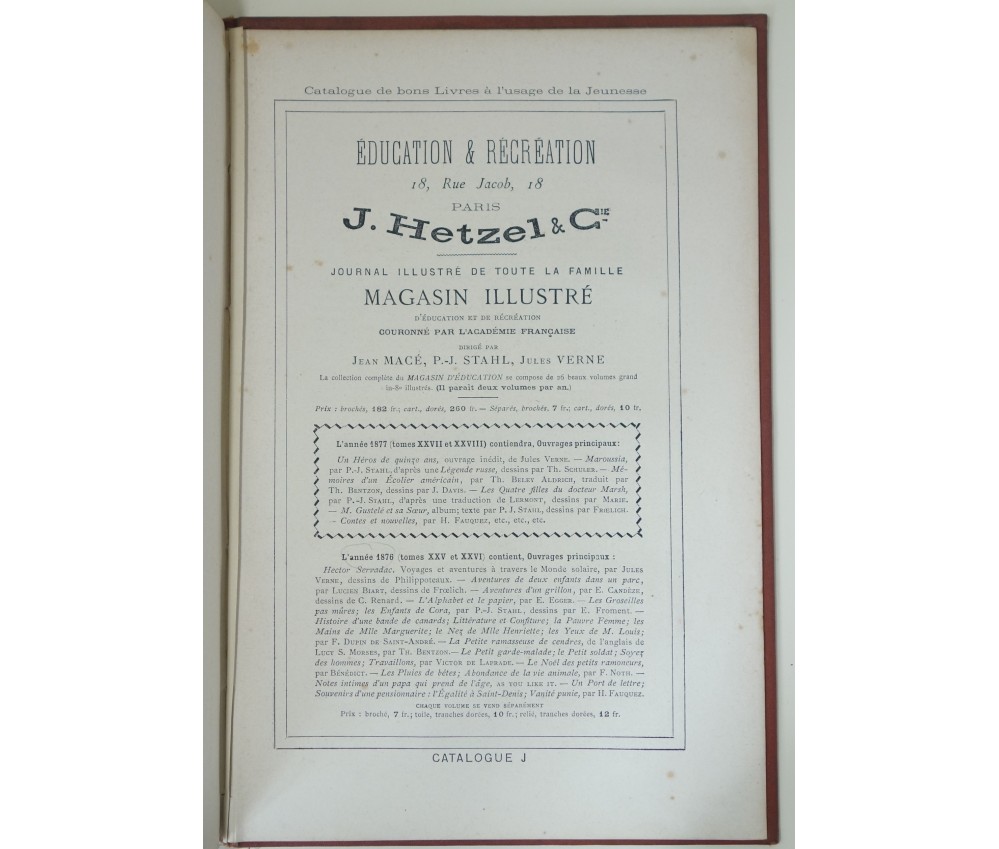 Voir nos visuels, 1ère édition, Voyages Extraordinaires, Edition J. Hetzel, 173 pages + catalogue J pour 1877, sd (circa 1877). In-4, cartonnage havane aux initiales JV -JH, reliure Ch. Magnier, plaque de Berger, 2ème plat illustré type Magnier C1, tranches dorées, légère usure des coins, légers frottements aux mors et coiffes, cahiers déréglés, intérieur propre légèrement bruni, quelques rousseurs. Dessins par J. Férat gravé par C. Barbant. Bon exemplaire rare dans ce coloris. Envoi rapide et soigné! (F22)