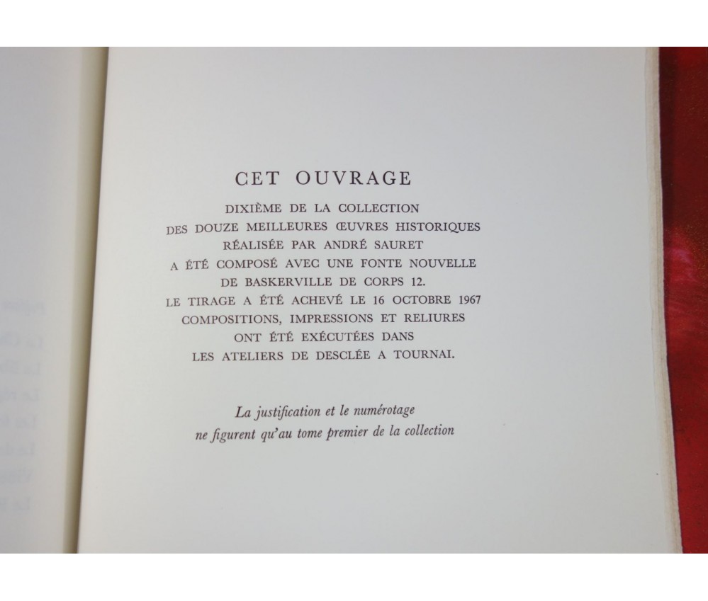 Voir nos visuels, bel et rare exemplaire, un des 980 exemplaires numérotés sur vergé d'Arches filigrané (n°10 pour celui-ci, mais seul le 1er tome est justifié), 10ème ouvrage de la Collection des douze meilleures œuvres historiques, André Sauret éditeur, 334 pages, 1967. Gravures hors texte en pleine page, certaines en couleurs. Impressions et reliures par les Ateliers Desclée à Tournai. Grand in-8 (22,5 x 17 cm), superbe reliure plein cuir rouge, dos à nerfs et caissons ornés, plats encadrés, tranche de tête dorée, belles gardes marbrées et nacrées. étui bordé cuir et garni tissu (légères usures), intérieur très propre, léger dégorgement des gardes. D'autres tomes de la collection en vente. Envoi rapide et soigné! (Y4)