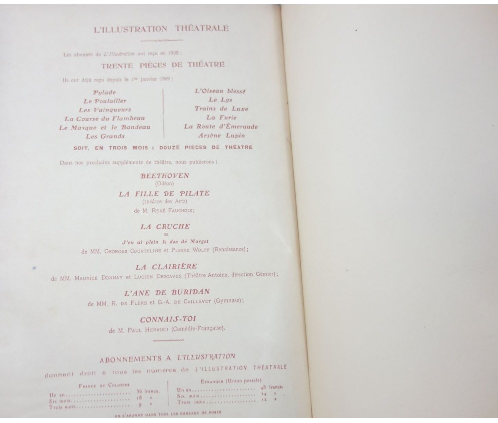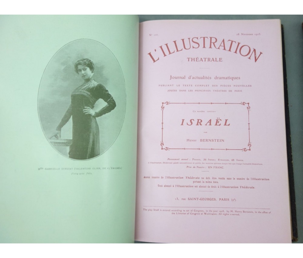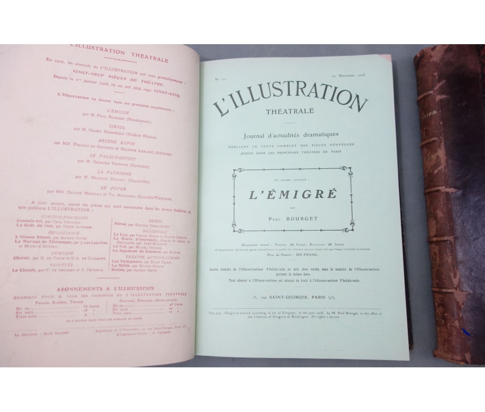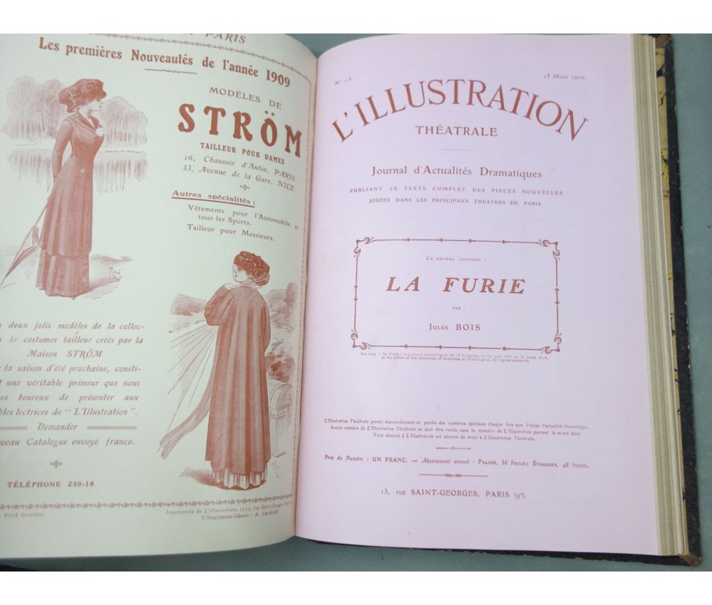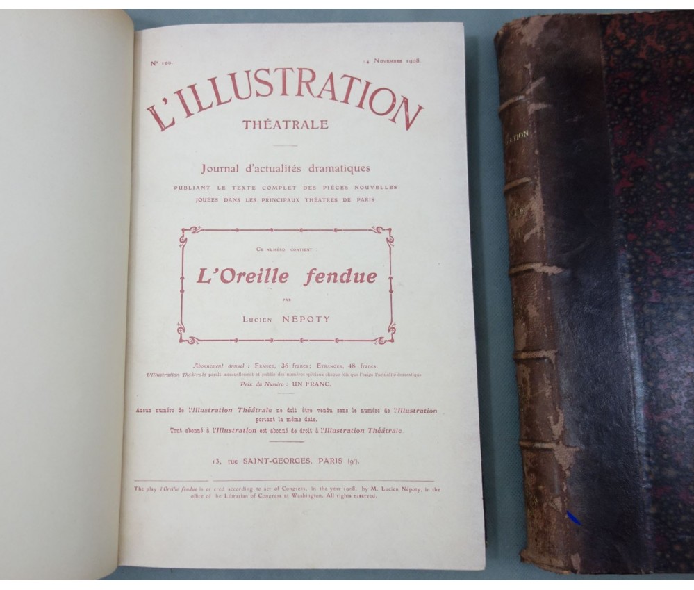 Voir nos visuels, les 2 volumes contenant 29 ou 30 pièces, à partir du n°100 au 115 (pas le 109), les autres non déterminés, les années ne sont pas complètes. Paris, l'Illustration, 1908 et 1909. Nombreuses gravures in texte en noir, couvertures en couleurs conservées dans le 1er volume. 2 petits In-4, reliures demi-cuir (coins usés, accrocs et éraflures), intérieur plus ou moins jauni, quelques taches. Nombreux livres illustrés et belles reliures à découvrir dans notre librairie! Envoi rapide et soigné! (F9)