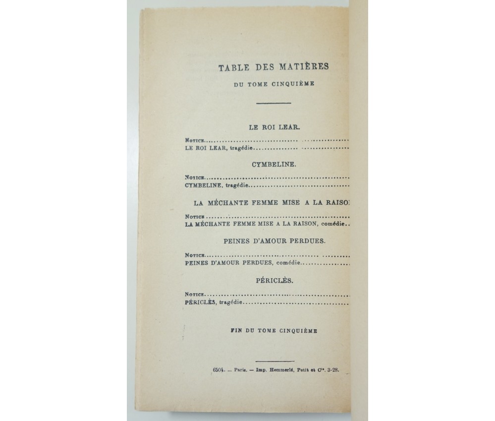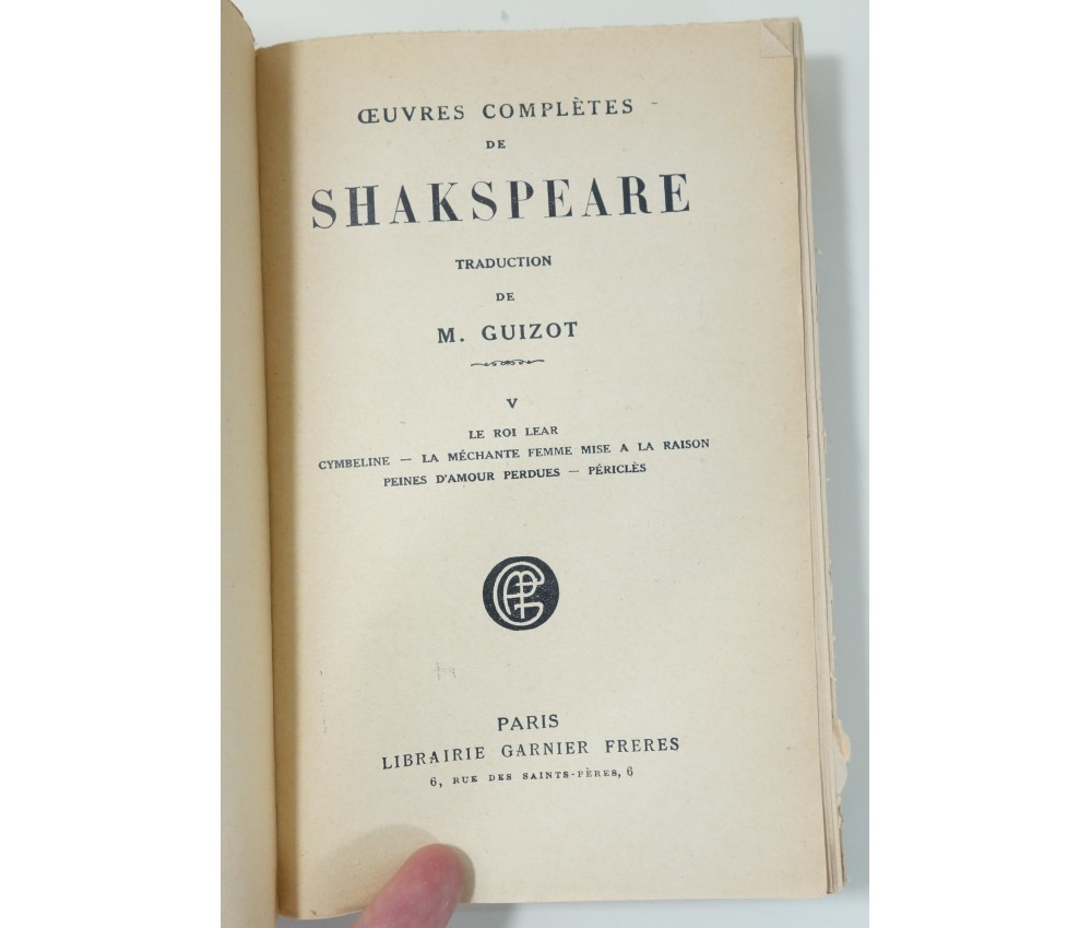 Voir nos visuels, Oeuvres complètes de Shakespeare Tome V, trad. de M. Guizot, Paris, Librairie Garnier, 515 pages, sans date (1928?). In-12 broché, couverture imprimée (dos ridé et jauni), intérieur propre légèrement jauni. Exemplaire peu fréquent de la traduction de Guizot. Envoi rapide et soigné! (Z5)