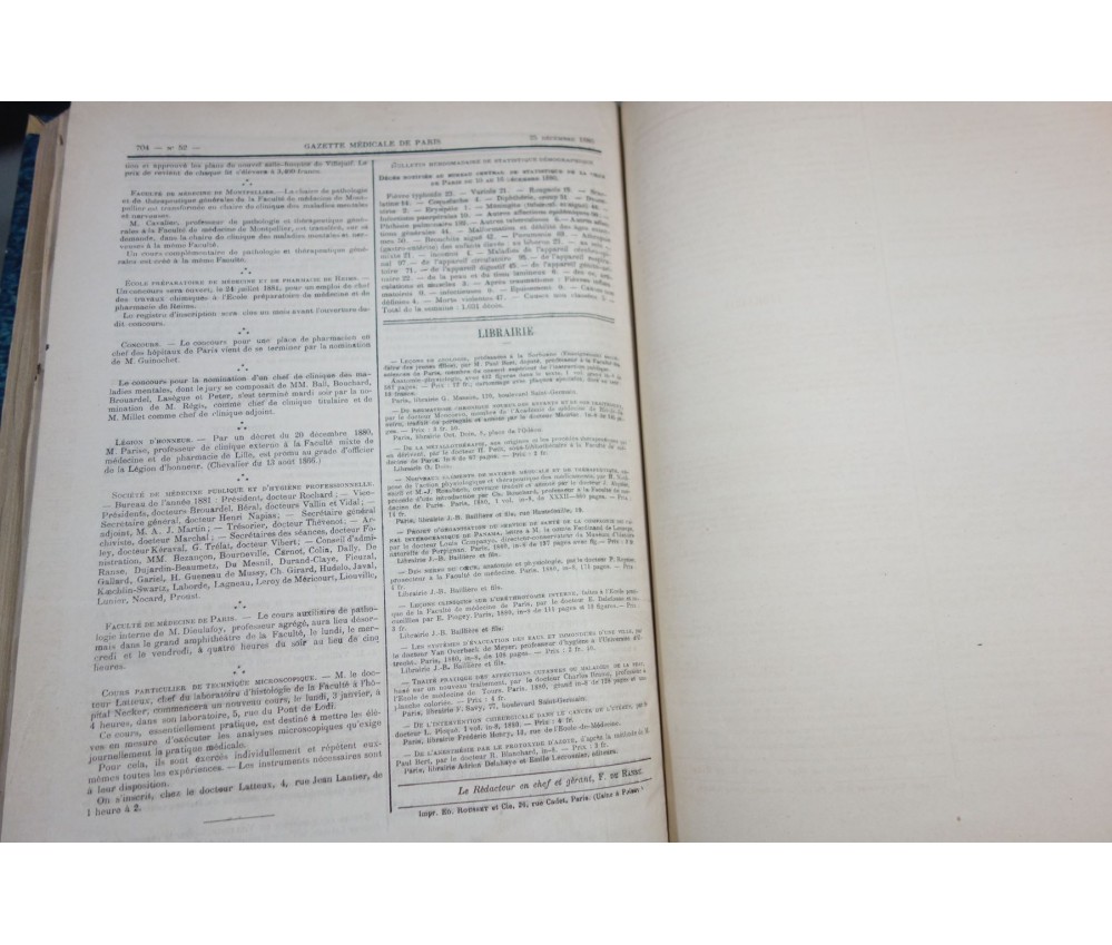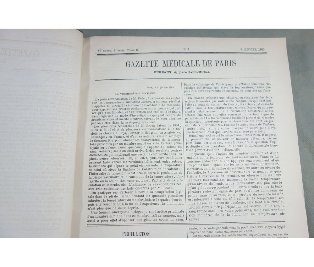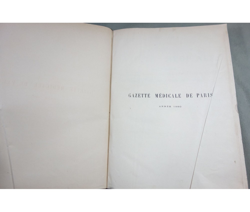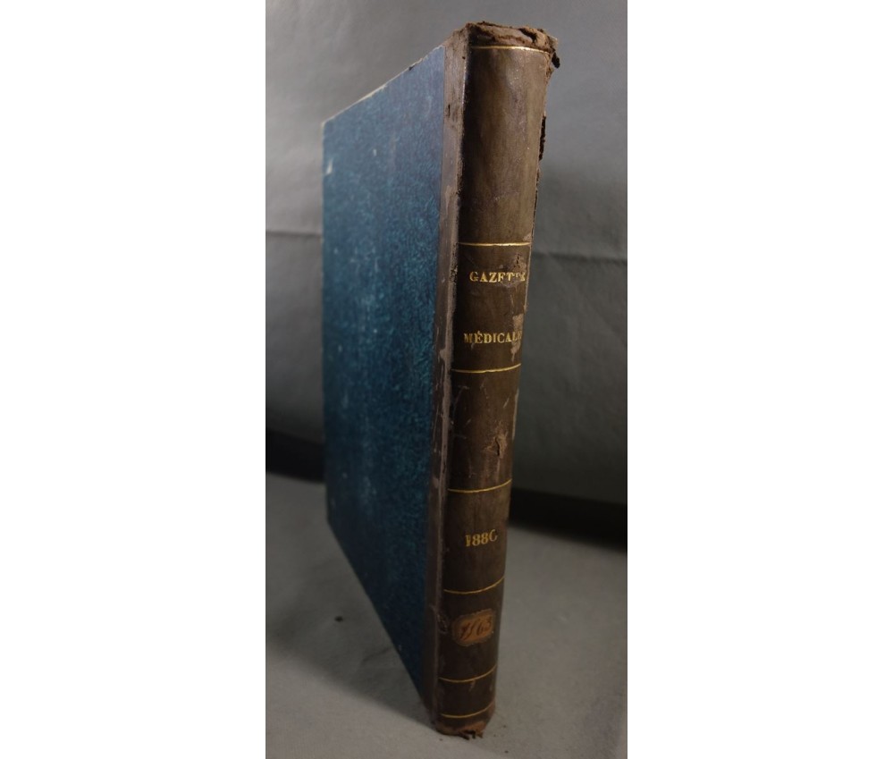 Voir nos visuels, rare exemplaire, texte sur 2 colonnes. Environ 50 numéros, 51ème année, 6ème série, tome II. Paris, Au bureau de la Gazette Médicale, 704 pages, 1880. Fort In-4, reliure demi-cuir (bords et coins usés, coiffes abimées), dos lisse, plats marbrés, intérieur plus ou moins bruni, quelques taches et tampons. Nombreux livres anciens de médecine et sciences à découvrir dans notre librairie! Envoi rapide et soigné! (f22)