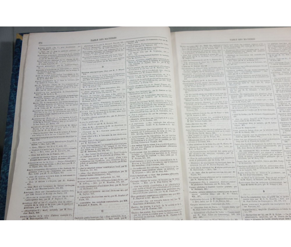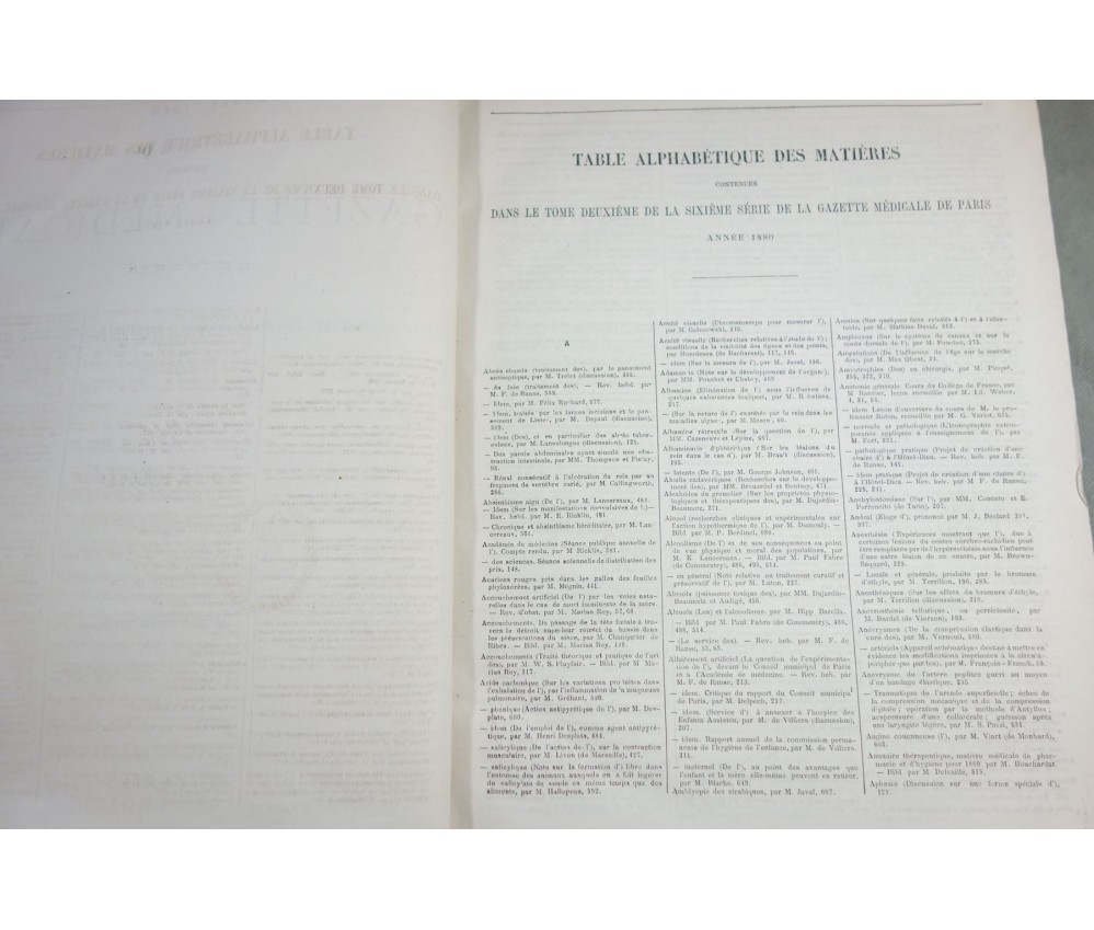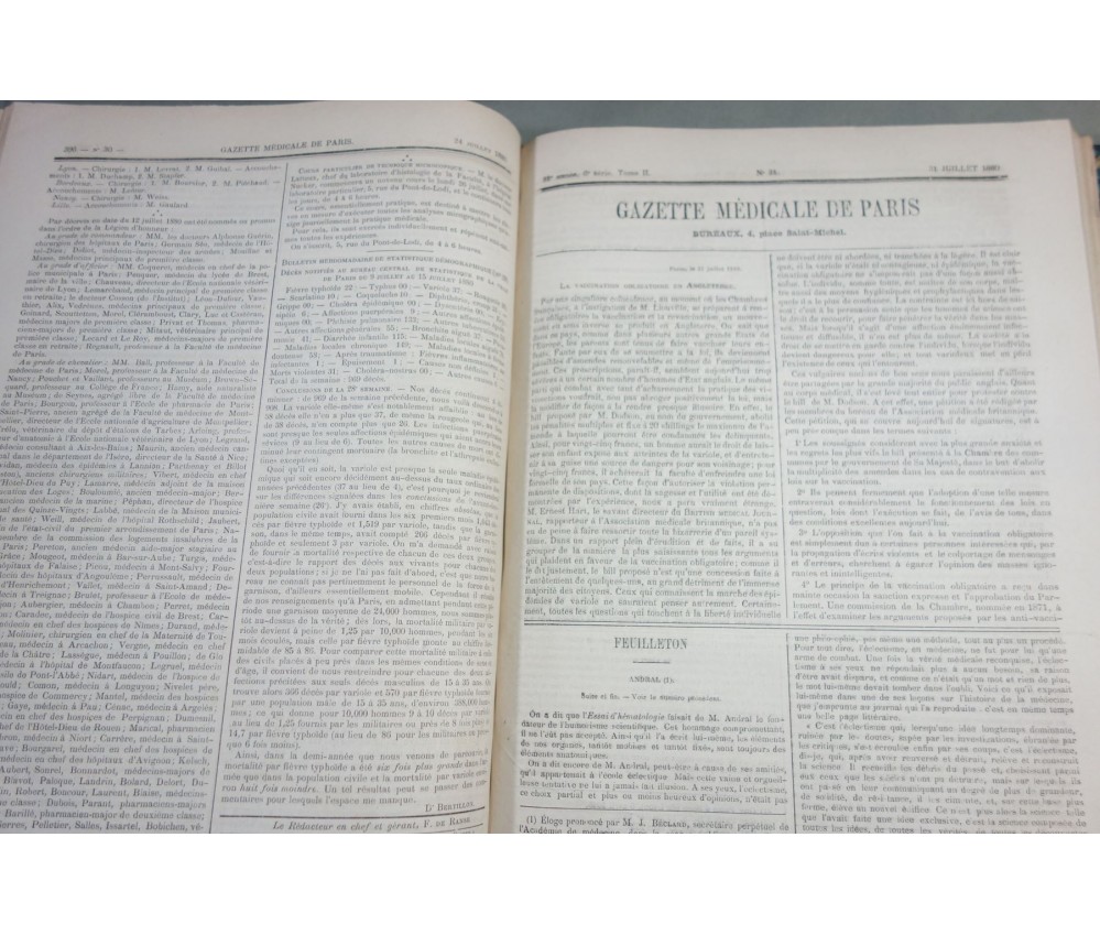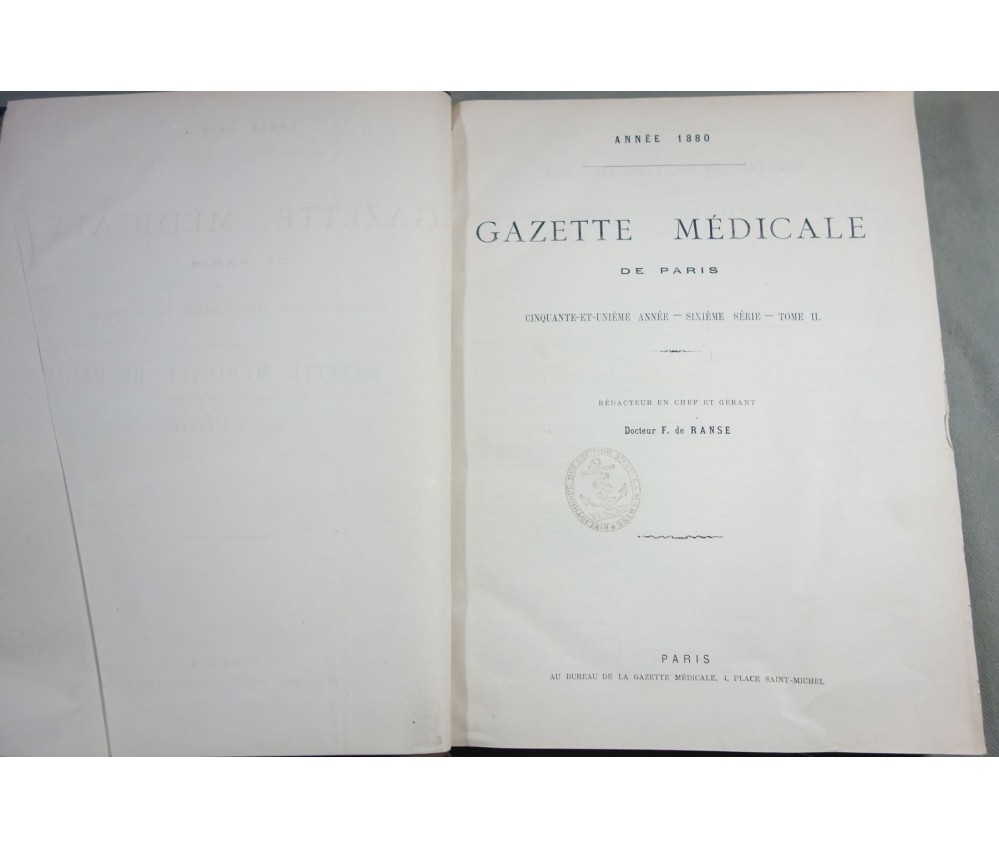 Voir nos visuels, rare exemplaire, texte sur 2 colonnes. Environ 50 numéros, 51ème année, 6ème série, tome II. Paris, Au bureau de la Gazette Médicale, 704 pages, 1880. Fort In-4, reliure demi-cuir (bords et coins usés, coiffes abimées), dos lisse, plats marbrés, intérieur plus ou moins bruni, quelques taches et tampons. Nombreux livres anciens de médecine et sciences à découvrir dans notre librairie! Envoi rapide et soigné! (f22)