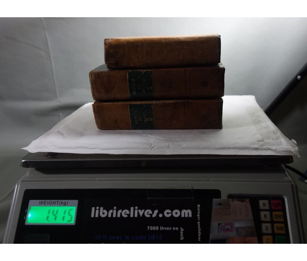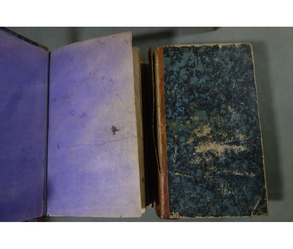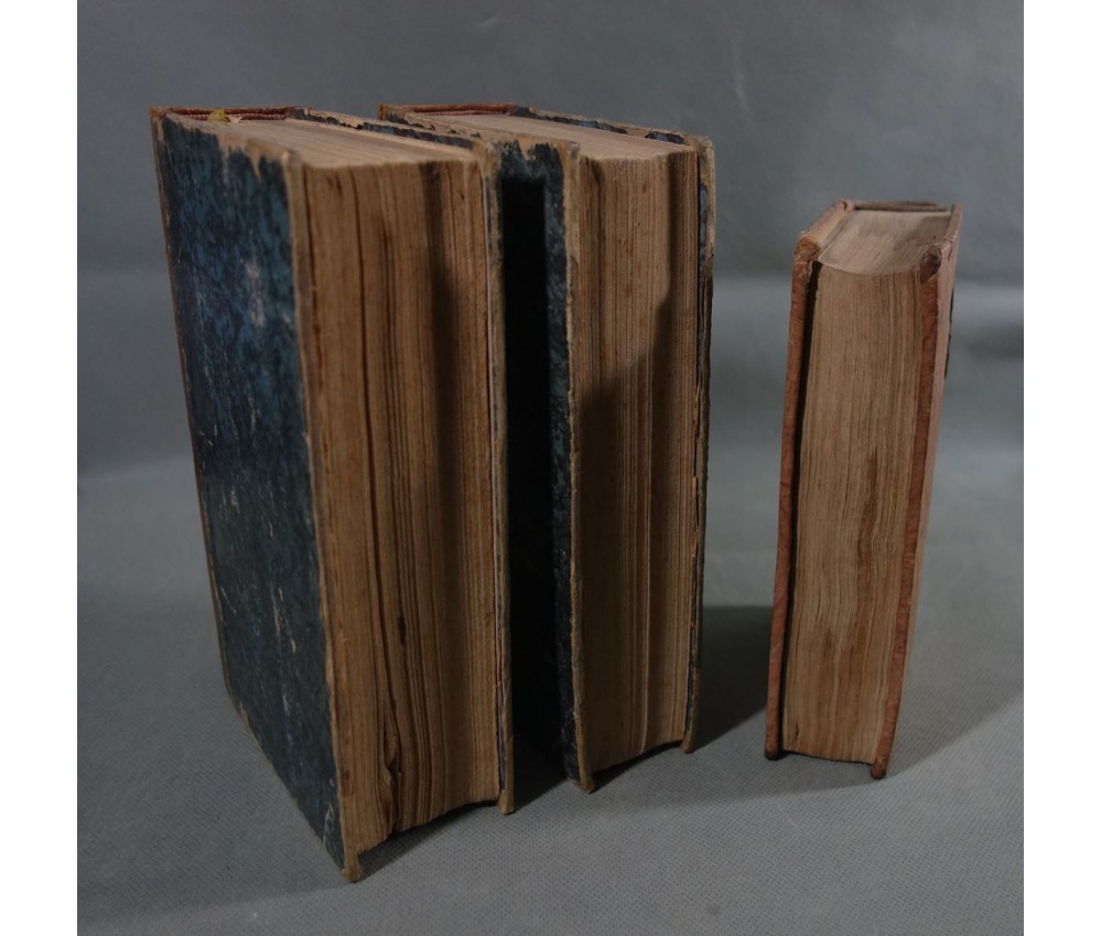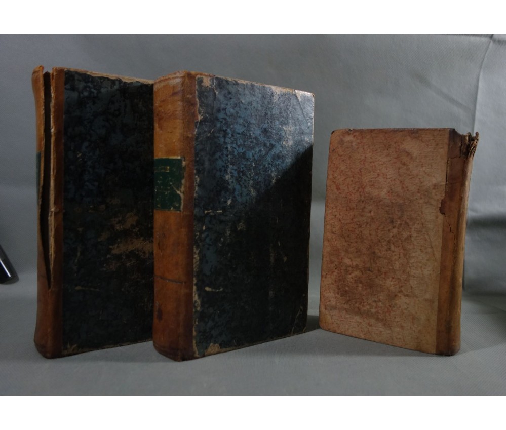 Voir nos visuels, lot de 3 livres anciens VENDUS EN L'ETAT. Firmin-Didot, 750 + 772 pages et Dabo, 503, 1821. 2 forts In-12 et 1 in-16, demi-reliures d'époque endommagées (coins rognés, 1 mors ouvert, manque à 1 coiffe, taches et éraflures), dos lisses, intérieur sur vélin jauni, avec des taches et des rousseurs, mouillures. Nombreux livres anciens et rares à découvrir dans notre librairie. Envoi rapide et soigné! (A10)