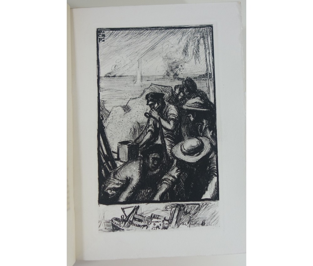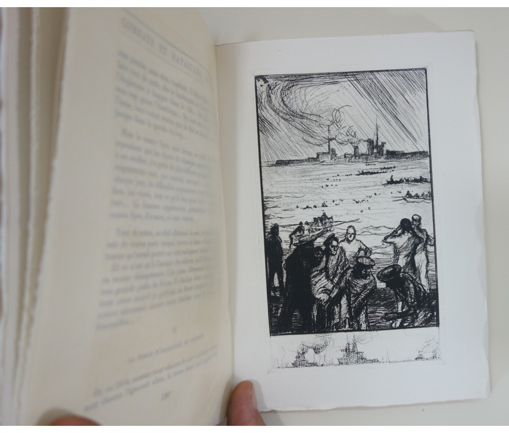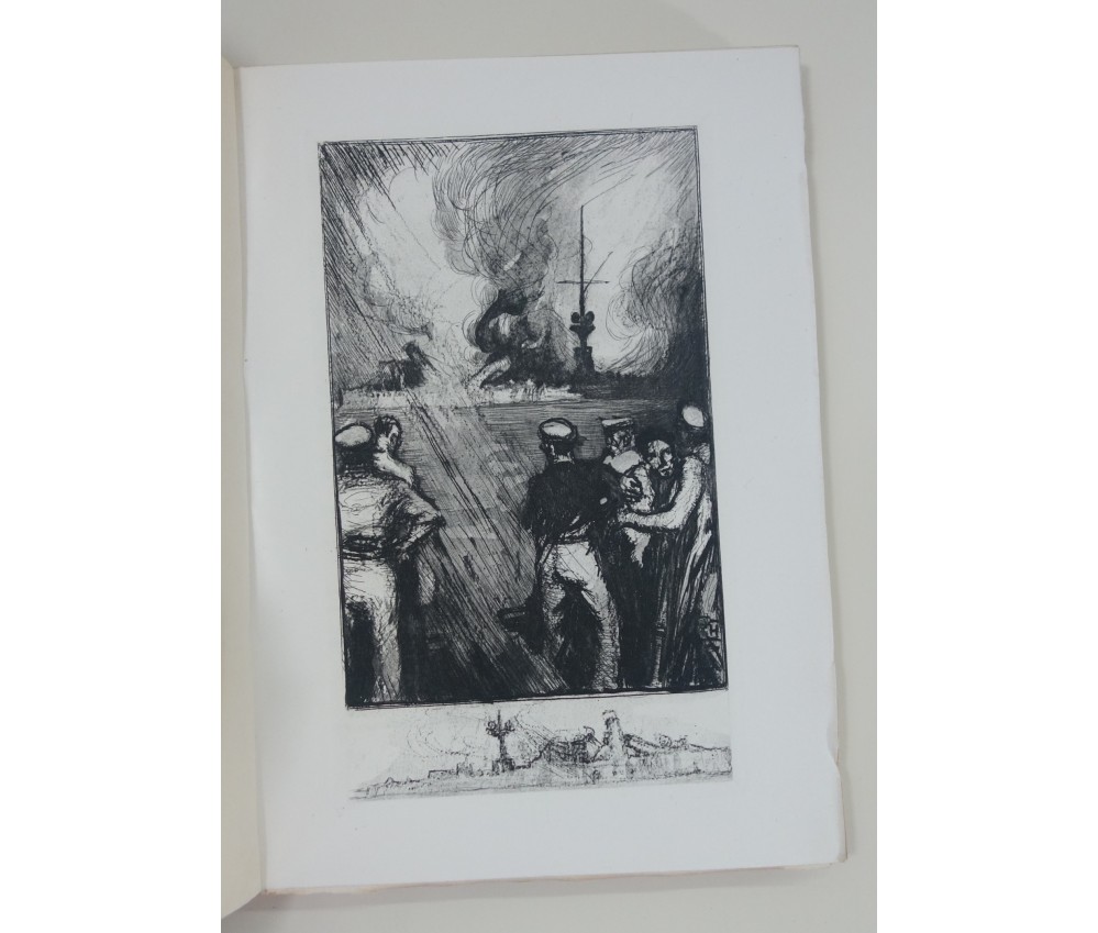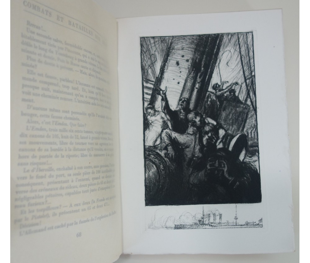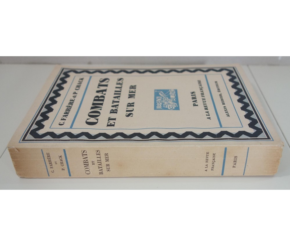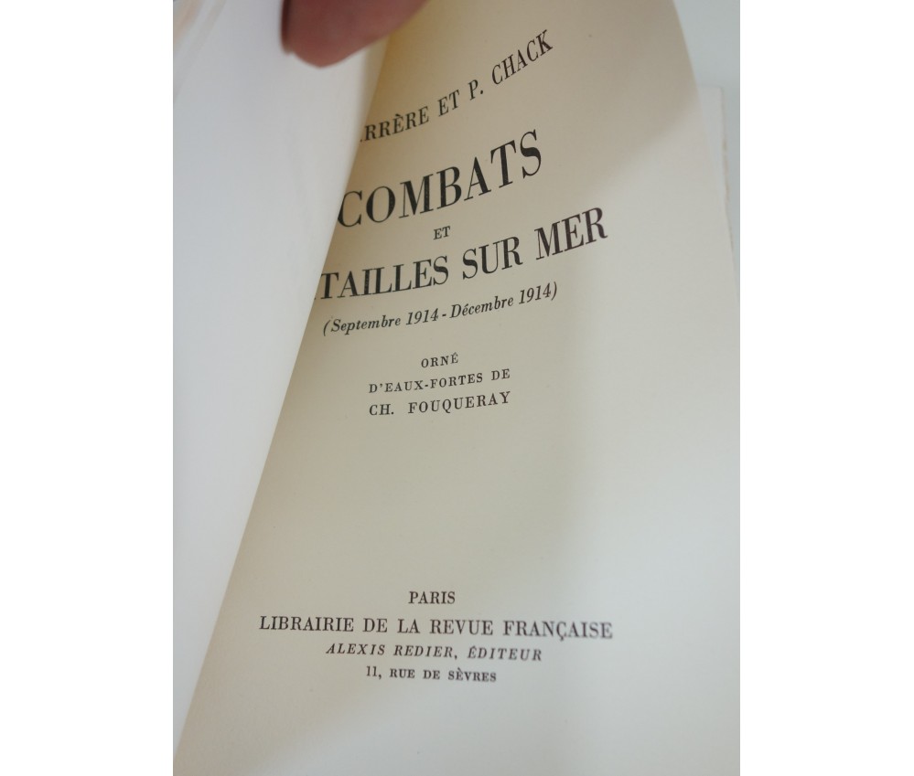 Voir nos visuels, belles eaux-fortes de Ch. Fouqueray, 1 des 1060 exemplaires numérotés sur vélin Vidalon, Paris, La Revue Française - Alexis Redier, collection Le paon blanc, 260 pages, sd (1929). In-8 broché, couverture imprimée, intérieur très frais, dos légèrement jauni avec de petites rides. Très bel exemplaire : Carteret V-76: "édition estimée",. Envoi rapide et soigné!(B20) Titre complet : Combats et batailles sur mer (Septembre 1914 - Décembre 1914). Orné d'eaux-fortes de Ch. FOUQUERAY.