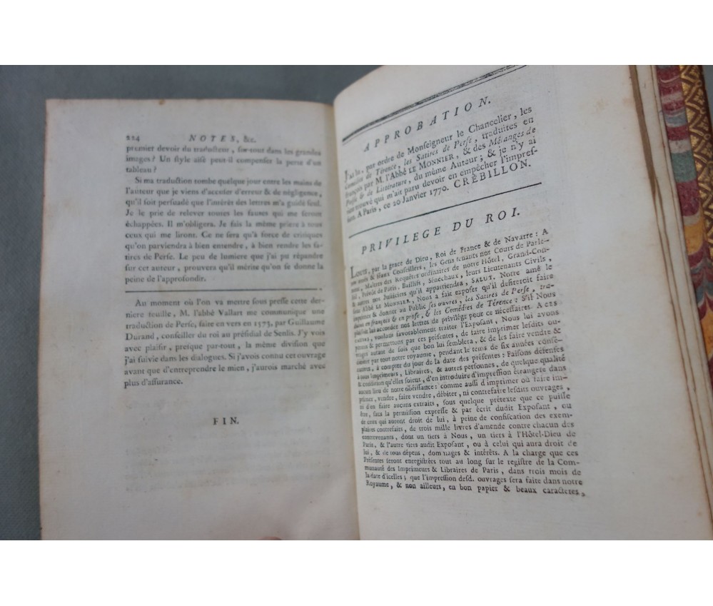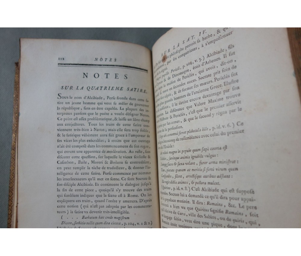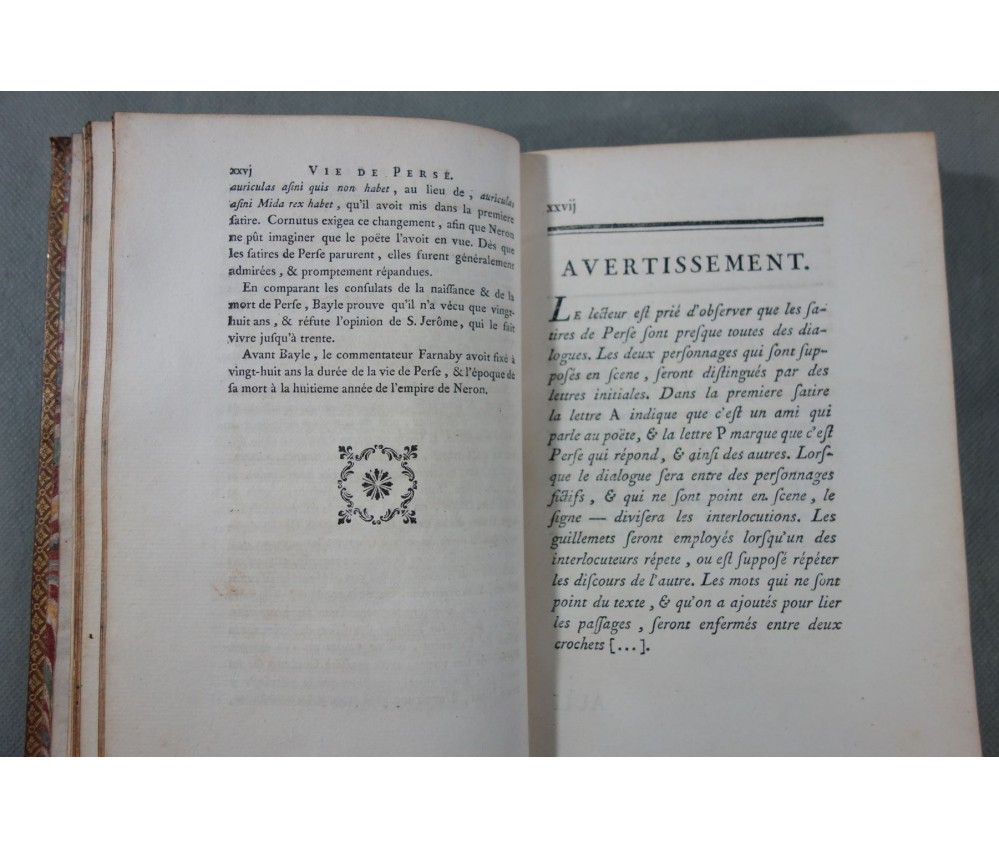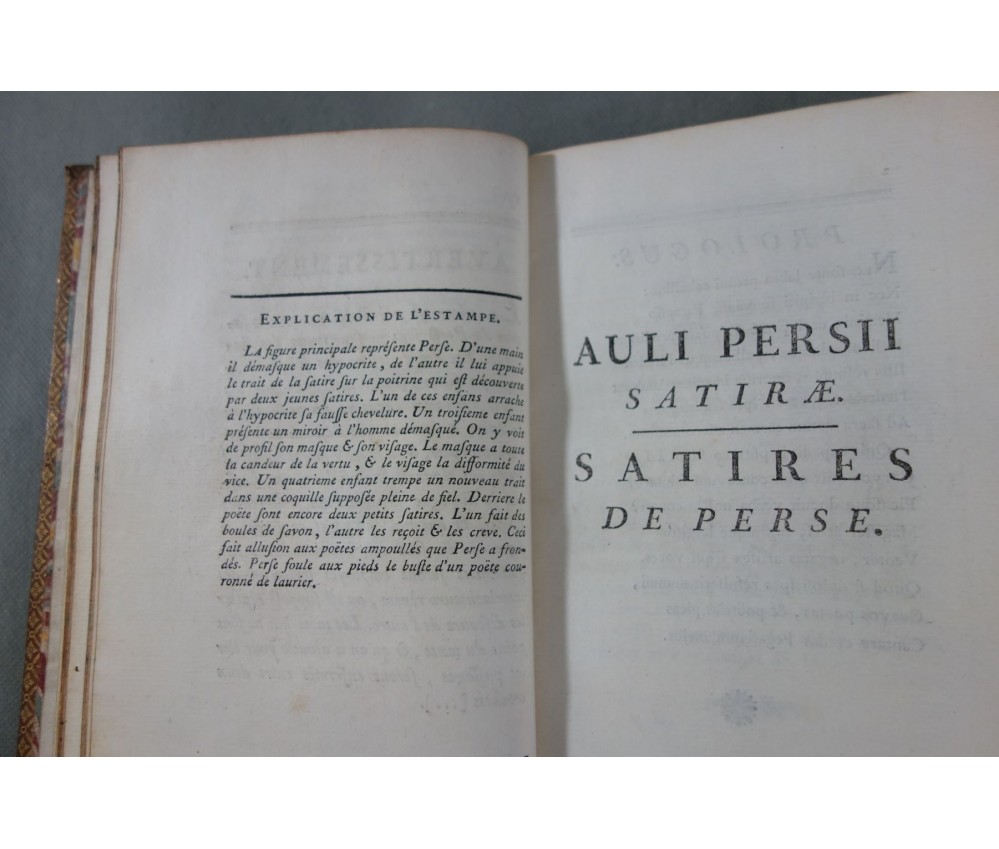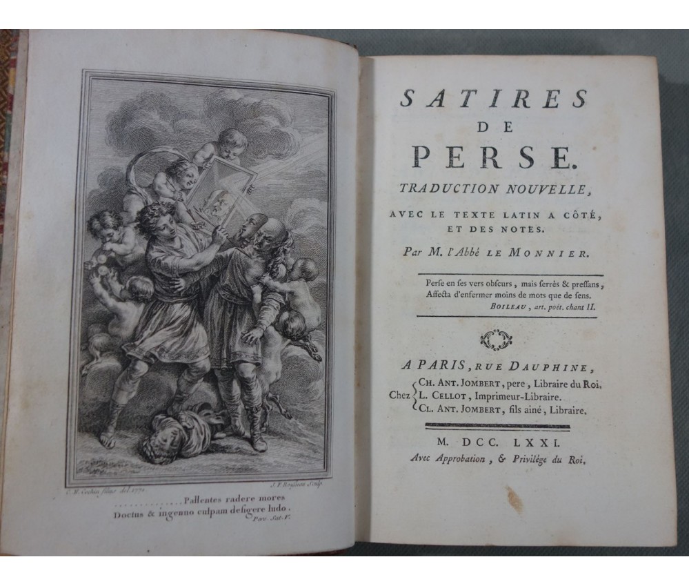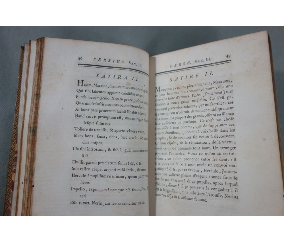 Voir nos visuels, bon et rare exemplaire, belle reliure plein veau, bilingue, première édition de la traduction avec des notes, la plus estimée de Dusaulx et celle qui a servit de base à toutes les éditions suivantes (Didot...), cf. PSAUME, Manuel du Libraire, p. 198. Belle estampe de Perse en frontispice. Paris, Jombert et Cellot, libraires, XXVII + 224 pages, 1771. Petit In-8, bonne reliure luxueuse plein cuir de l'époque (coins rognés, mors fendus, accrocs, éraflures), caissons ornés, plats encadrés de filets et roulettes, tranches dorées, gardes marbrées, intérieur sur un beau papier vergé, quelques rousseurs. Nombreux livres anciens et rares à découvrir dans notre librairie! Envoi rapide et soigné! (B11)