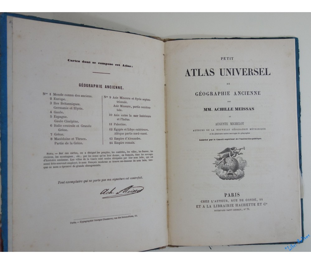 Voir nos visuels, atlas bien complet de ses 14 planches en double page montées sur onglet, cartes rehaussées de couleur sur les frontières, Paris, Chez L'Auteur et Hachette, sans date (circa 1900). Bonne édition de ces élégantes cartes anciennes. In-8, cartonnage éditeur imprimé (bords et dos tissé abimés et marqués), intérieur assez propre (quelques marques et léger brunissement). Envoi rapide et soigné!(MM7)