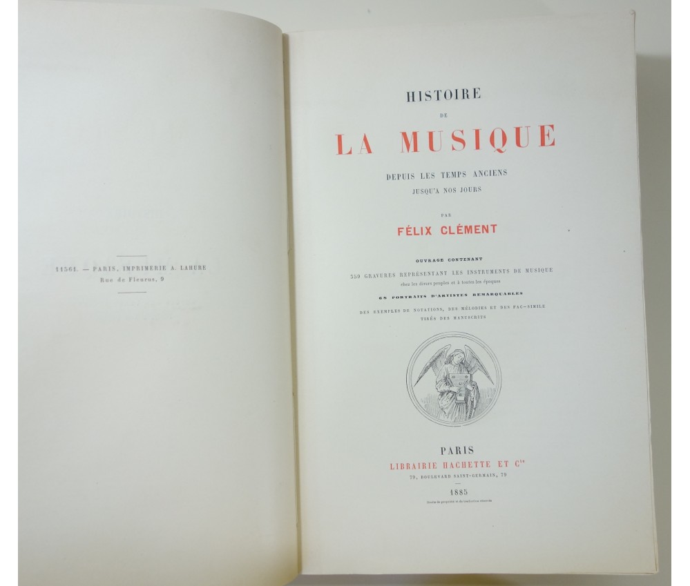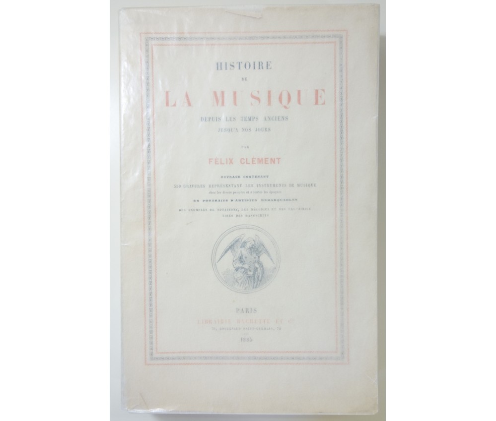 Voir nos visuels, très bel exemplaire sur vélin, Paris, Librairie Hachette, V + 819 pages, 1885. Ouvrage contenant 359 gravures représentant les instruments de musique chez les divers peuples et à toutes les époques, 68 portraits d'artistes remarquables, des exemples de notations, des mélodies et des fac-similé tirés des manuscrits. Très fort et grand in-8 broché, couverture imprimée sous papier cristal (petites déchirure en coin et une pliure au plat arrière), intérieur très propre, beau papier couché. +de 2kg. Envoi rapide et soigné! (Z19)
