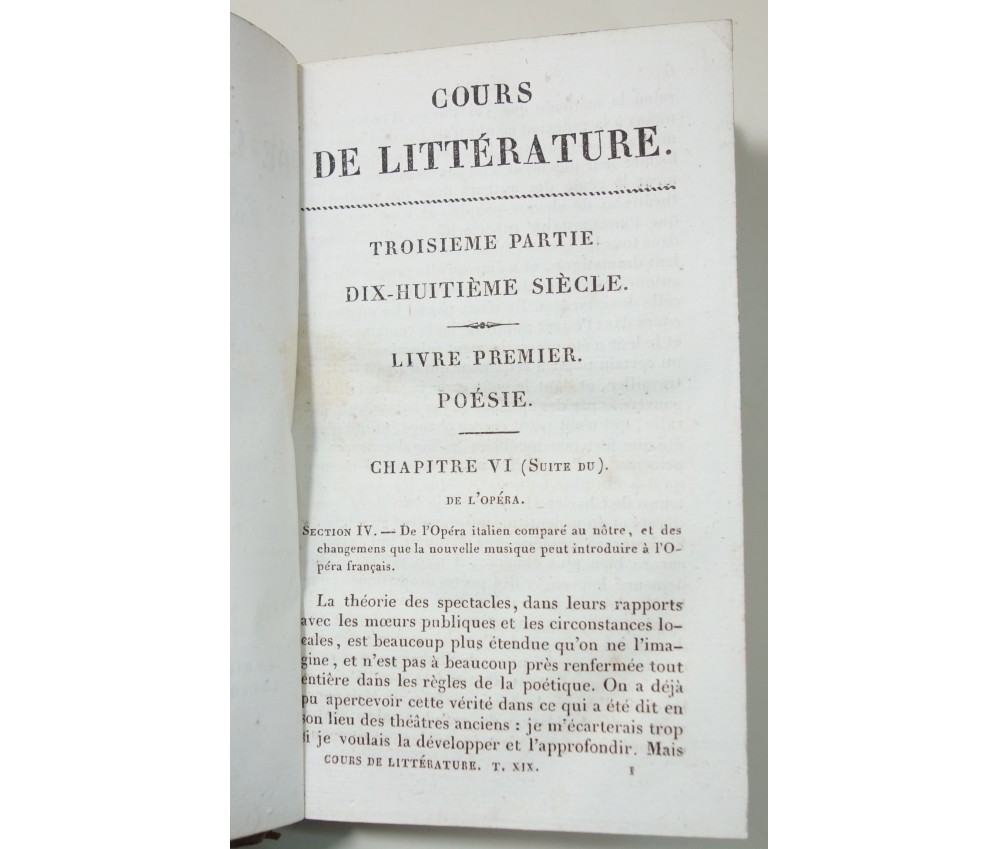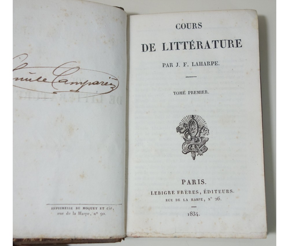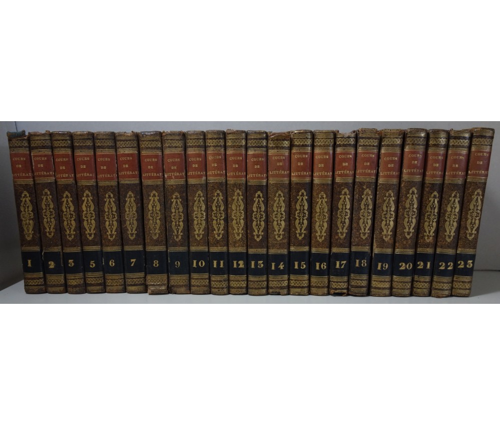 Voir nos visuels, rare ensemble de 22 volumes (sur 23, manque le tome 4). Cours depuis Aristote jusqu'au 19ème siècle. A Paris, Lebigre frères, éditeurs, Imprimerie de Moquet, 1834. 22 petits In-12 (3.2 kg), reliures demi-cuir (usures, des coiffes et coins abîmés), dos lisses ornés, pièces de titres rouges et noires, tranches et gardes marbrées, intérieur sur papier vergé blanc avec rousseurs et bunissures. Nombreux livres anciens, illustrés et reliures d'art à découvrir dans notre librairie! Envoi rapide et soigné! (W3)