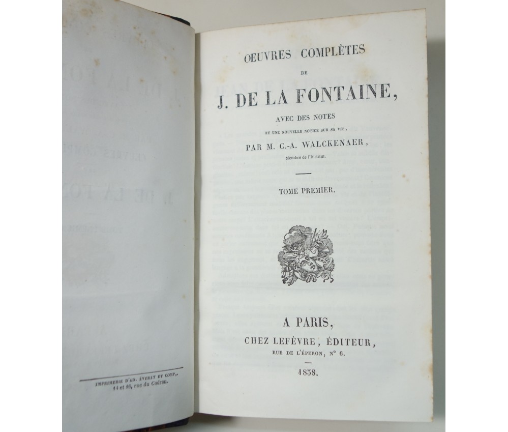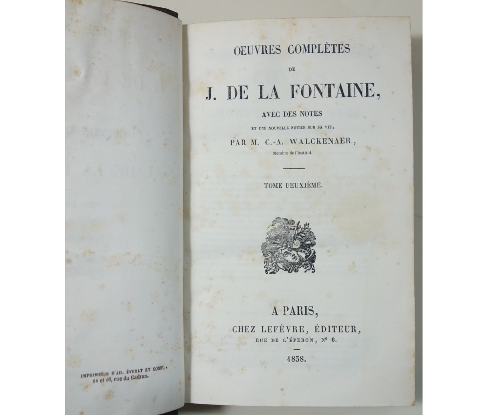 Voir nos visuels, rare ensemble complet en 2 volumes. Avec des notes et une nouvelle notice sur sa vie par M. CA. WALCKENAER. A Paris, Chez Lefèvre, éditeur, Imprimerie Everat, 1838. 2 In-8 (1.3 kg), reliures demi-cuir noir (usures des coins et bords, taches sur tranches), dos lisses, faux nerfs et titres dorés, plats et gardes marbrées, intérieur sur un vélin blanc avec rousseurs éparses. Nombreux livres anciens, illustrés et reliures d'art à découvrir dans notre librairie! Envoi rapide et soigné! (W3)