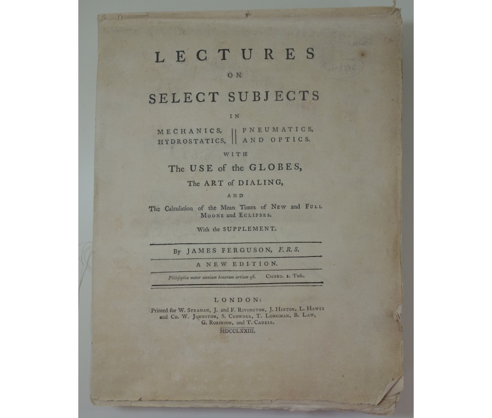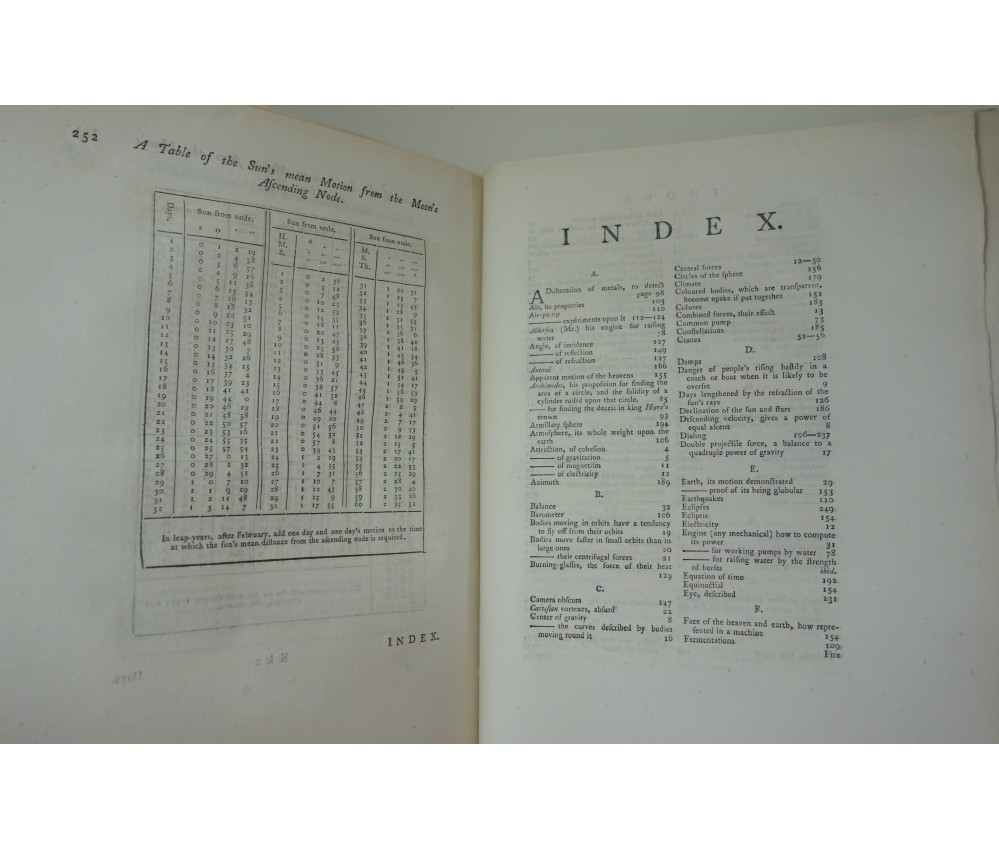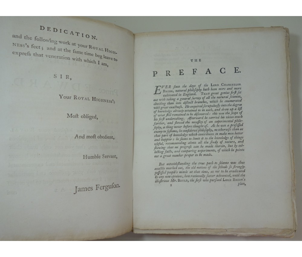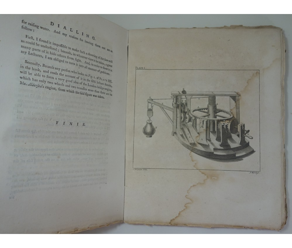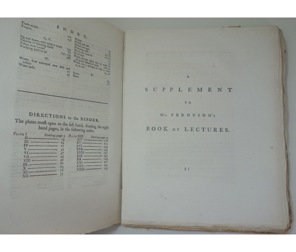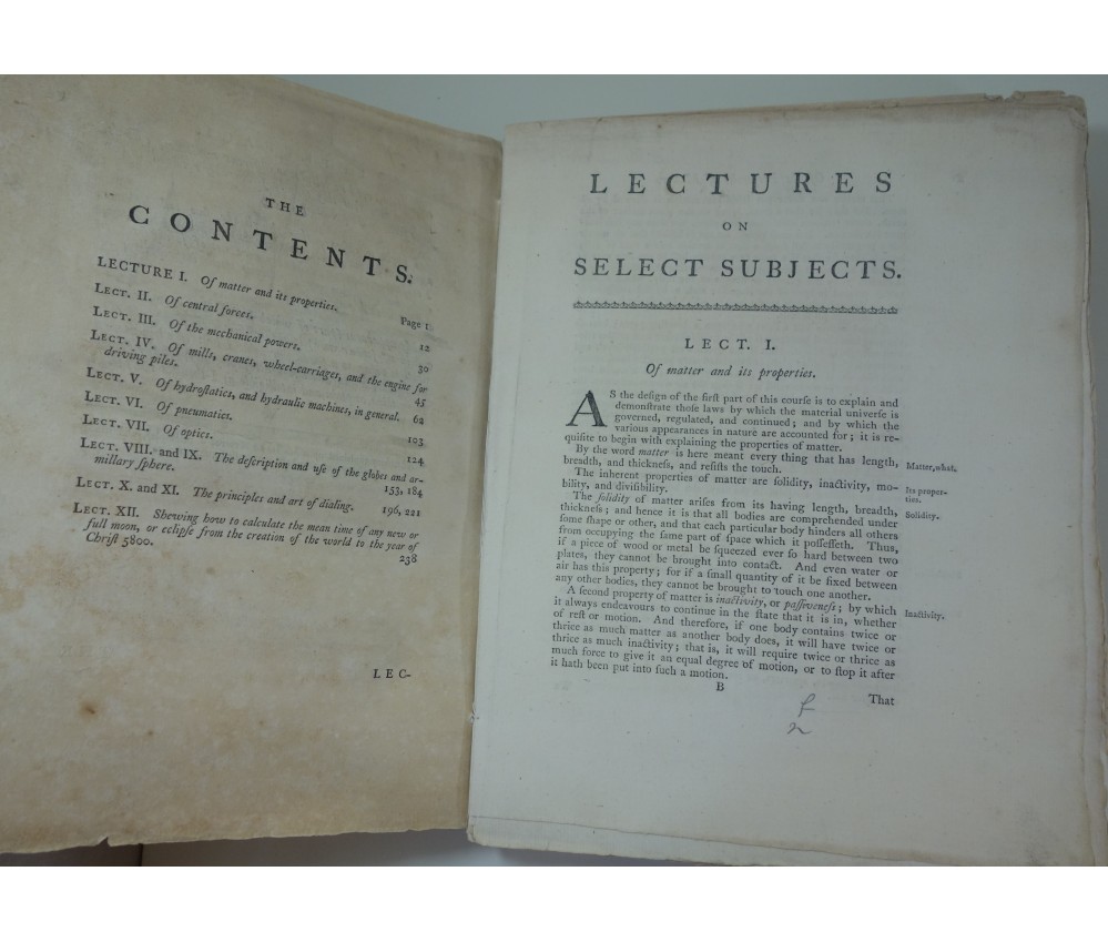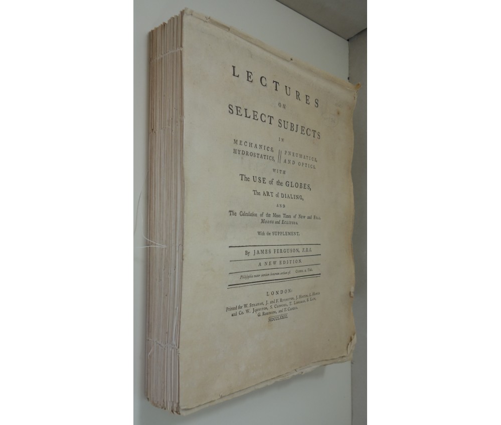 Voir nos visuels, bien complet des 36 planches, London, Printed for W. Strahan, J. and F. Rivington, J. Hinton, L. Hawes... 256 pages + index et supplément, 1773. Superbes planches gravées de grande taille (mouillures et brunisssement). Fort in-4, couture d'attente (non relié), intérieur propre, sur vergé fort, quelques marques. Rare exemplaire bien complet. Envoi rapide et soigné! (Z7) Titre complet: Lectures on select subjects in mechanics, hydrostatics, pneumatics, and optics : With the use of the globes, the art of dialing, and the calculation of the mean times of new and full moons and eclipses. With the supplement.