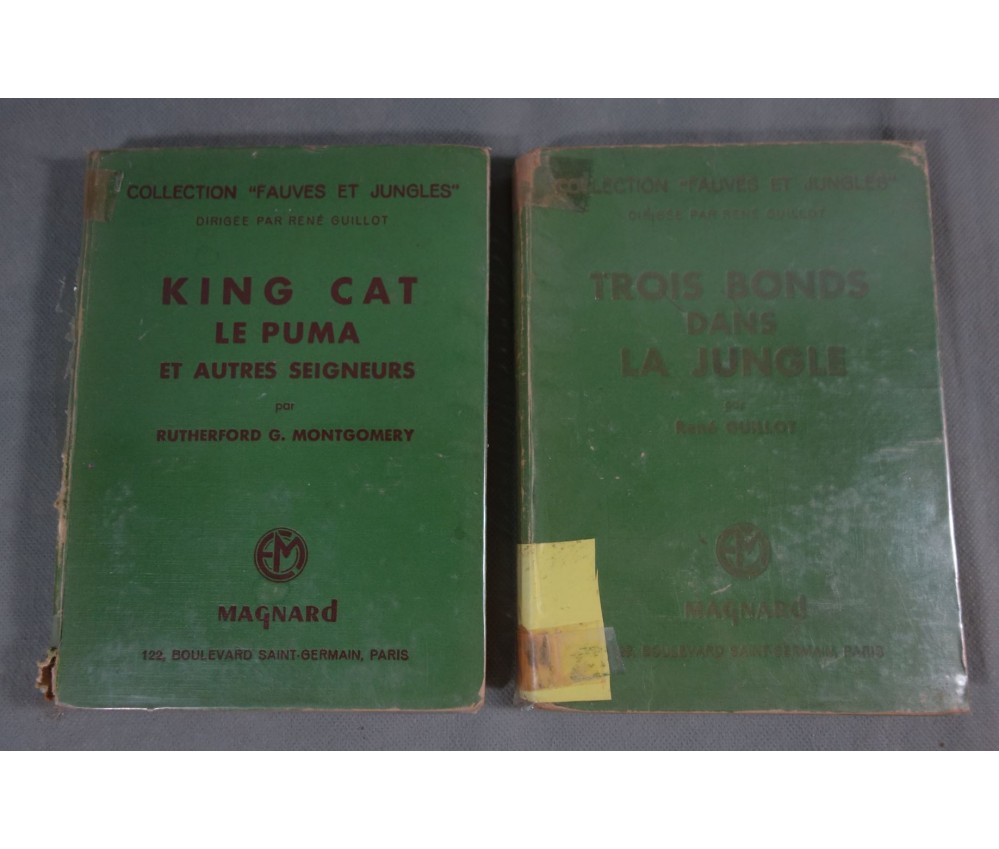 Voir nos visuels, lot de 2 livres vendus en l'état, Editions Magnard - collection Fauves et Jungles, 1952. Superbes illustrations en noir style Jouve. Livres en état moyen, dos abimé et bords usés, intérieur jauni, tampons, 1 livre déboité. Envoi rapide et soigné! (C2)