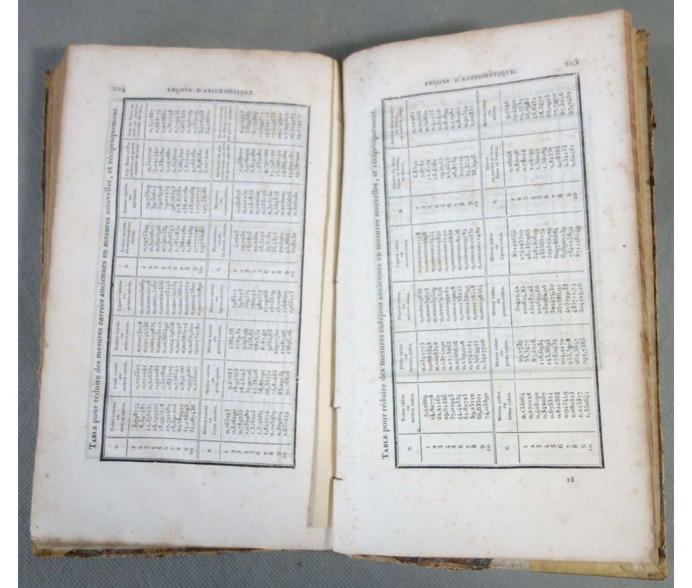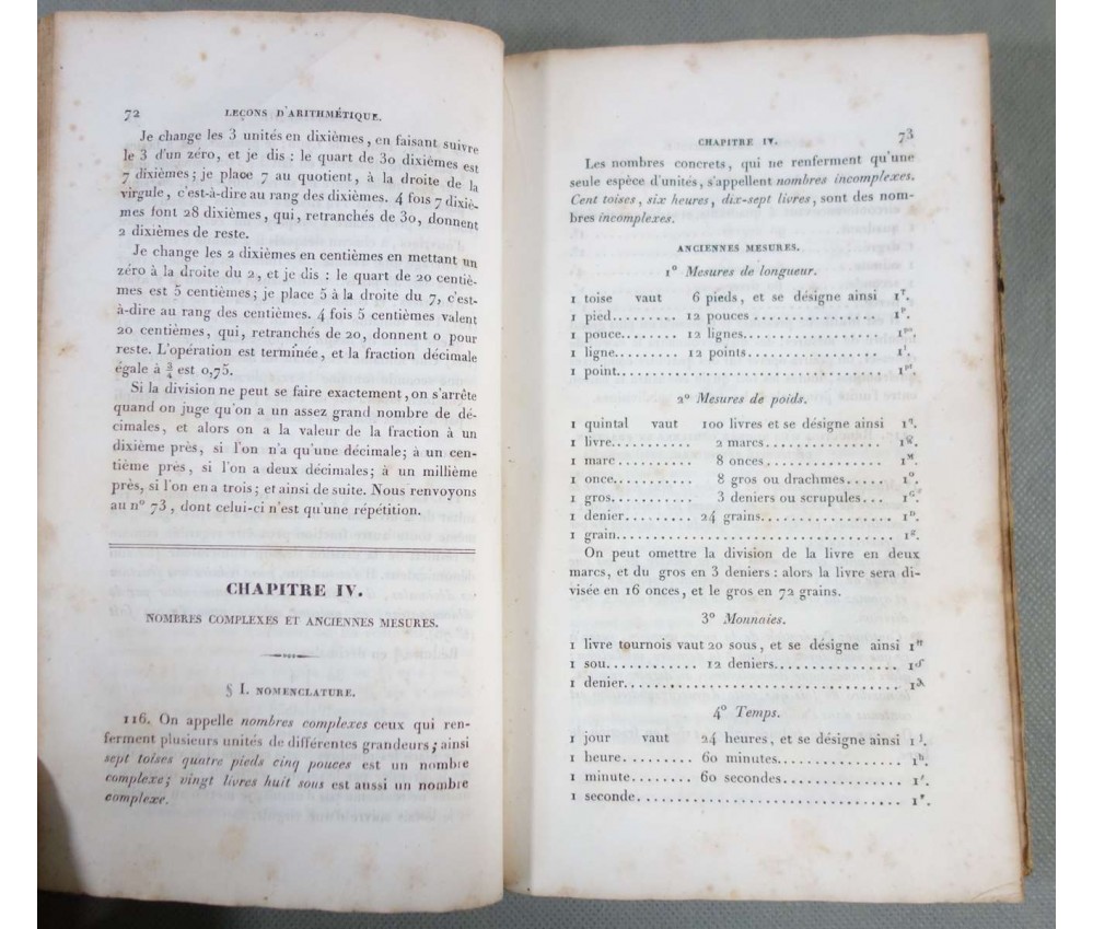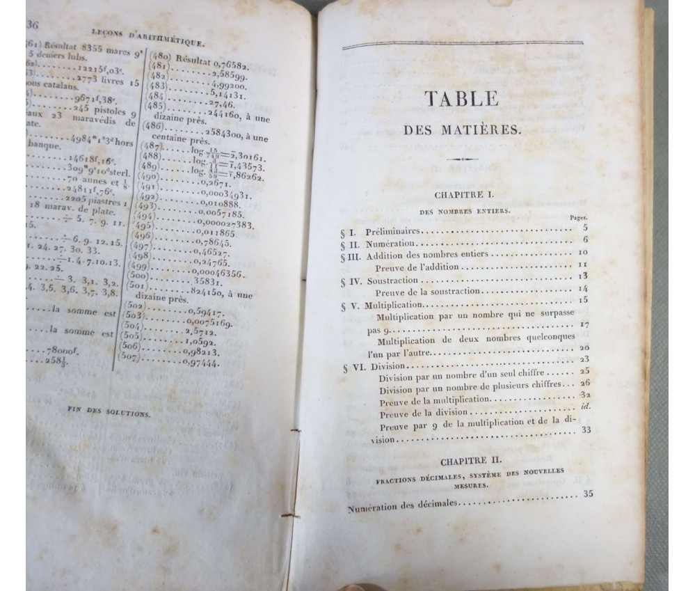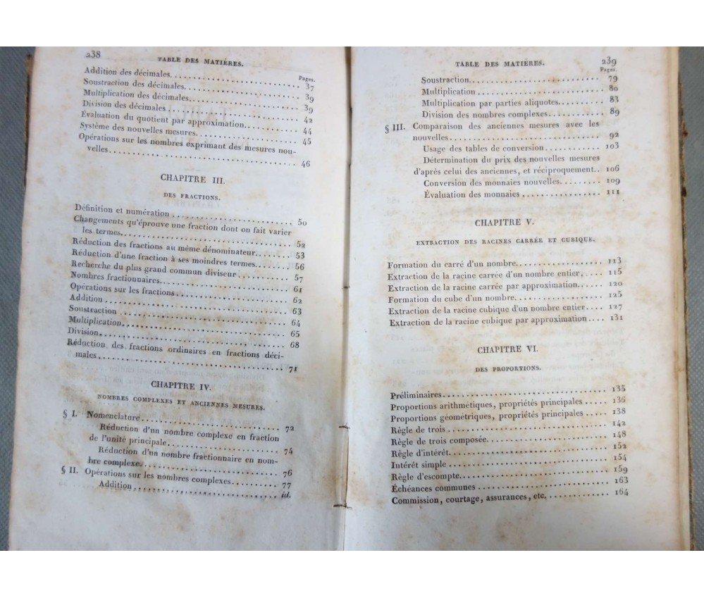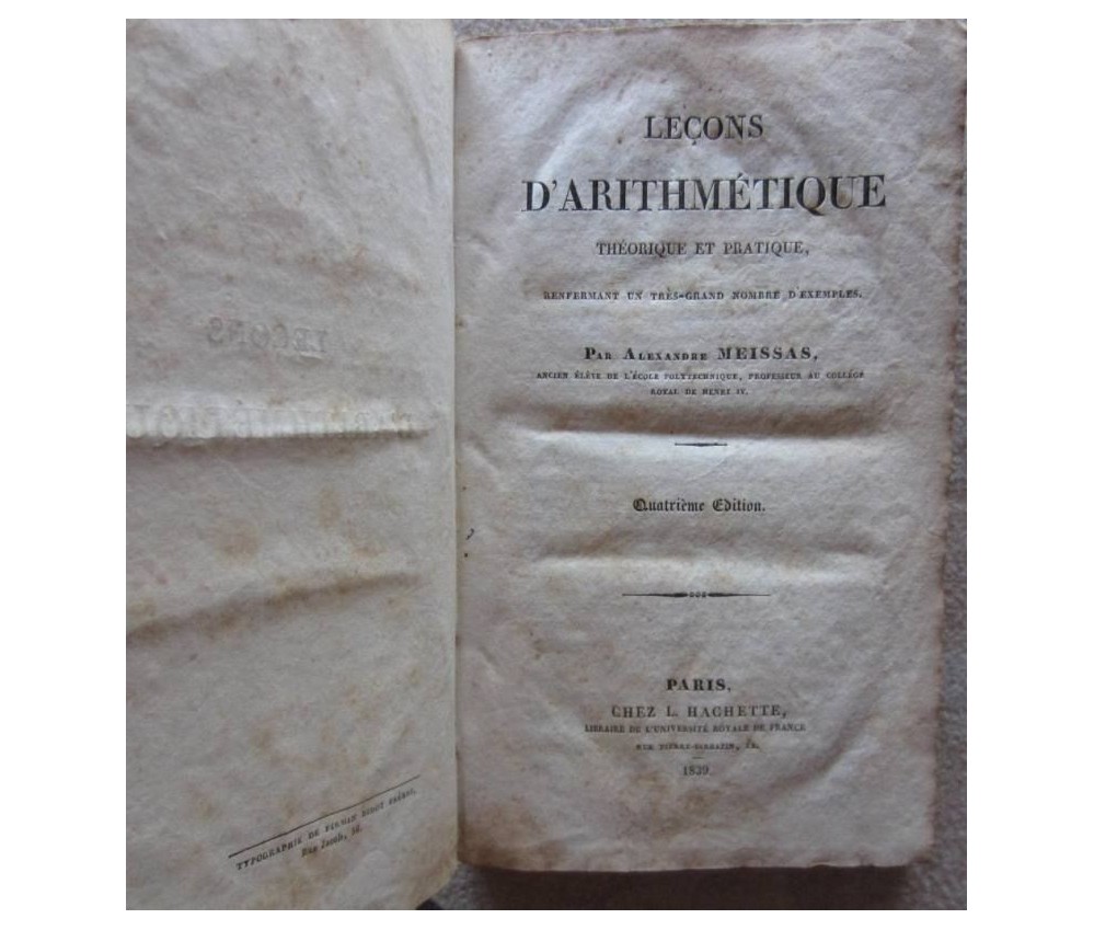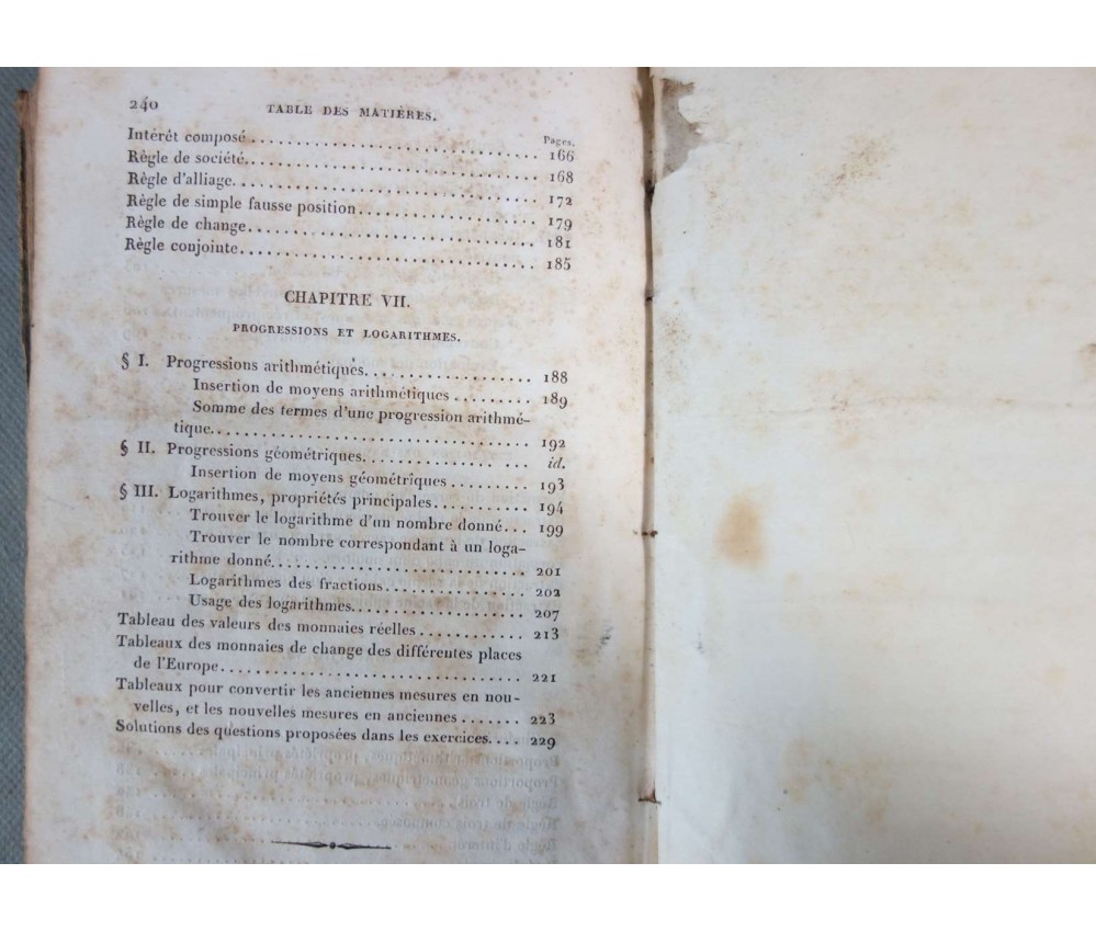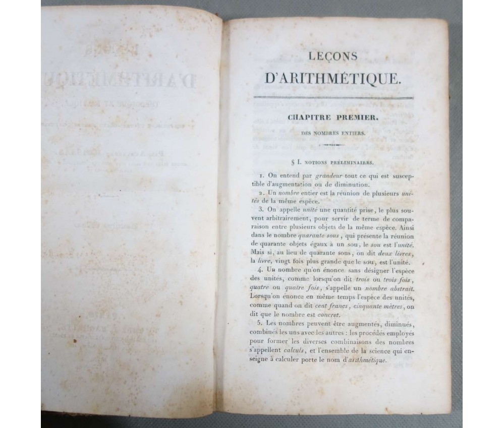 Voir nos visuels - 4è ed., Ed. Hachette, 240 pages, 1839, suite du titre: "renfermant un très grand nombre d'exemples". Petit in-8 cartonné, dos muet, intérieur propre mais nombreuses brunissures et dessins au crayon sur les contreplats, bords et coins très usés et rognés, plats frottés. Envoi rapide et soigné! (A17) Nombreux scolaires anciens en stock.