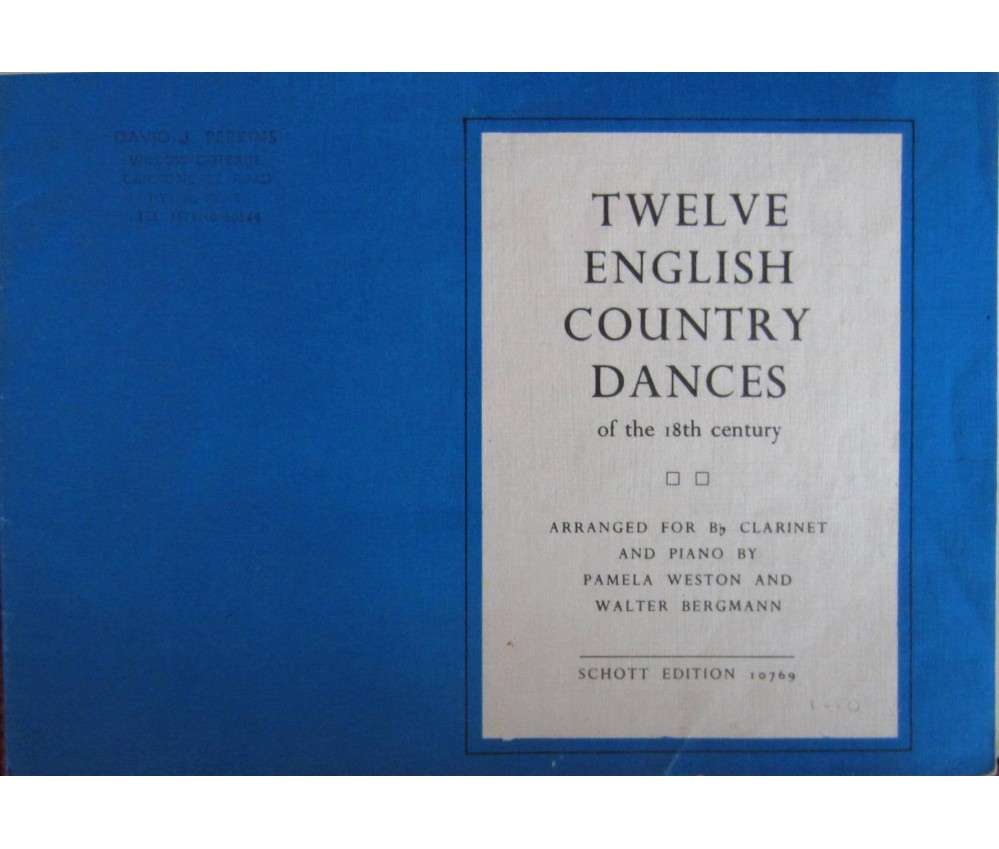 Voir nos visuels - Twelve English country dances of the 18th century, Ed. Schott, 12 morceaux, ref. 10769. 1 livret pour piano et clarinette de 12 pages + 1 livret mobile pour clarinette de 6 pages. Couverture un peu usée, partitions propres. Envoi rapide et soigné!(P2) Nombreuses partitions et méthodes pour clarinette et tous instruments en stock...