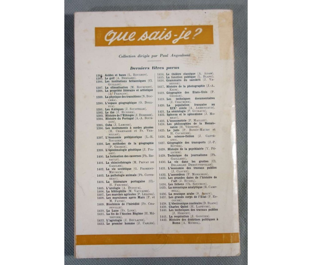 Voir nos visuels - Ed. PUF, collection Que sais-je, 126 pages, 1971, 10ème édition. Livre broché en bon état, intérieur propre mais jauni, petite usure des coins avec une coiffe scotchée et décoloration de la couverture. Envoi rapide et soigné! (QSJ) Nombreux Que sais-je en stock...