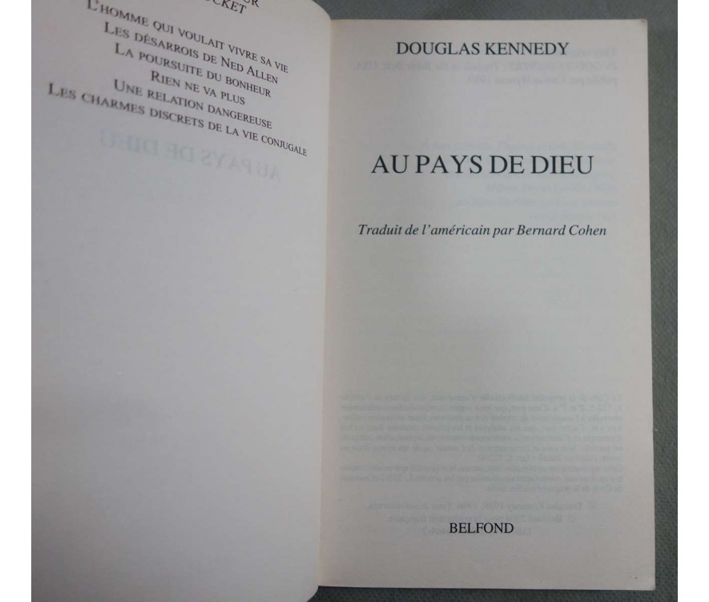 - Au pays de Dieu: 340 pages, 2007, livre en bon état, intérieur très propre mais nom et date sur première page, petite usure des bords, coins et coiffes de la couverture.