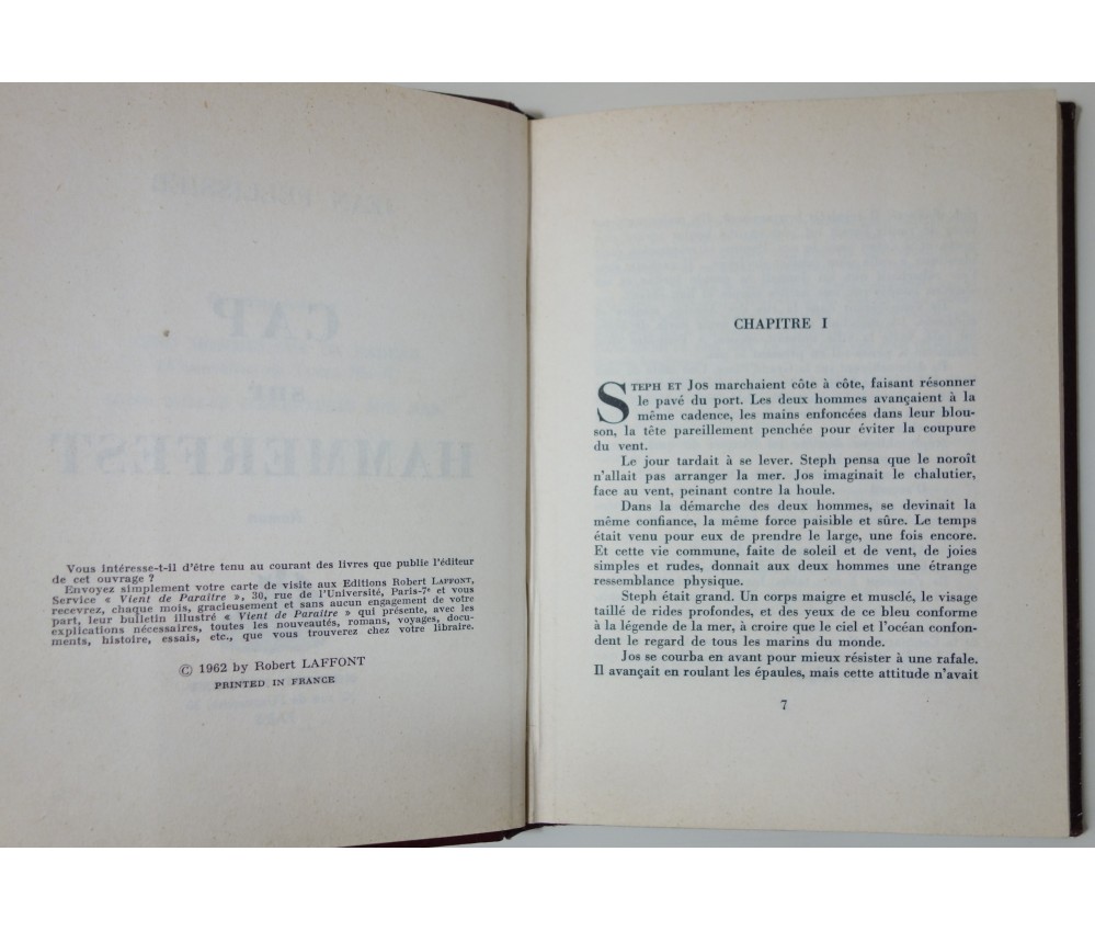 Voir nos visuels, exemplaire relié, sur vélin. Paris, Robert Laffont, 164 pages, 1962. Petit In-8, bonne reliure (usures des coins, marques), intérieur propre, légères piqûres en bordure. Nombreux ouvrages sur la Marine, les Navigateurs et les Voyages à découvrir dans notre boutique. Envoi rapide et soigné! (W2)