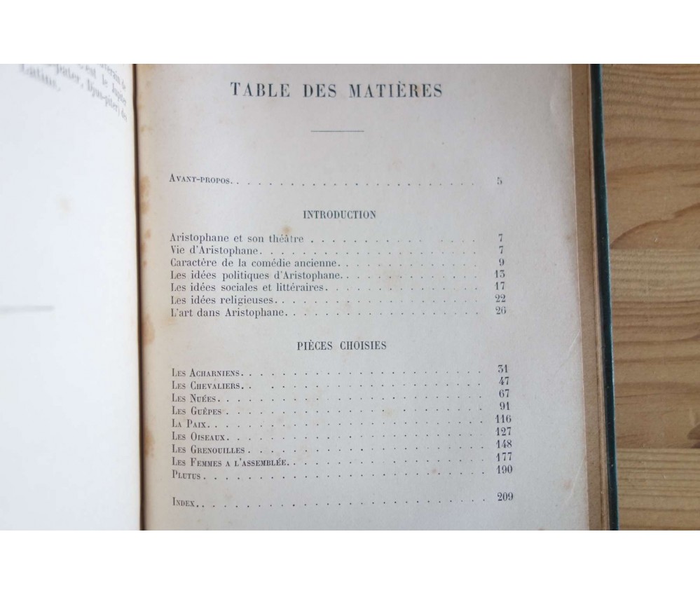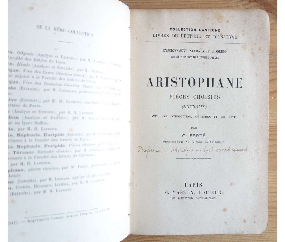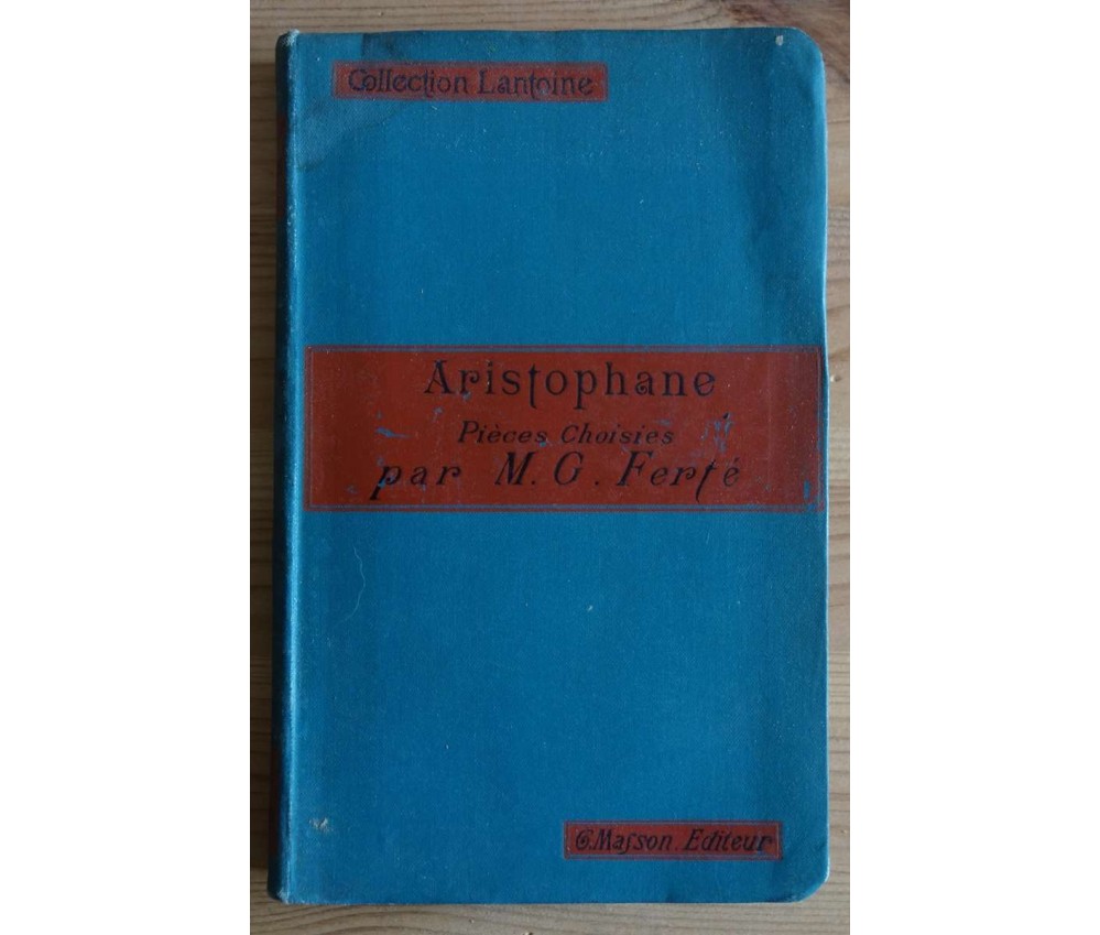 Aristophane, Pièces choisies par M. G. Ferté - Ed. Masson, collection Lantoine - sans date, 218 pages, relié, avec une dédicace de l'auteur. Pièces choisies (extraits) avec une introduction, un index et des notes par G. Ferté.