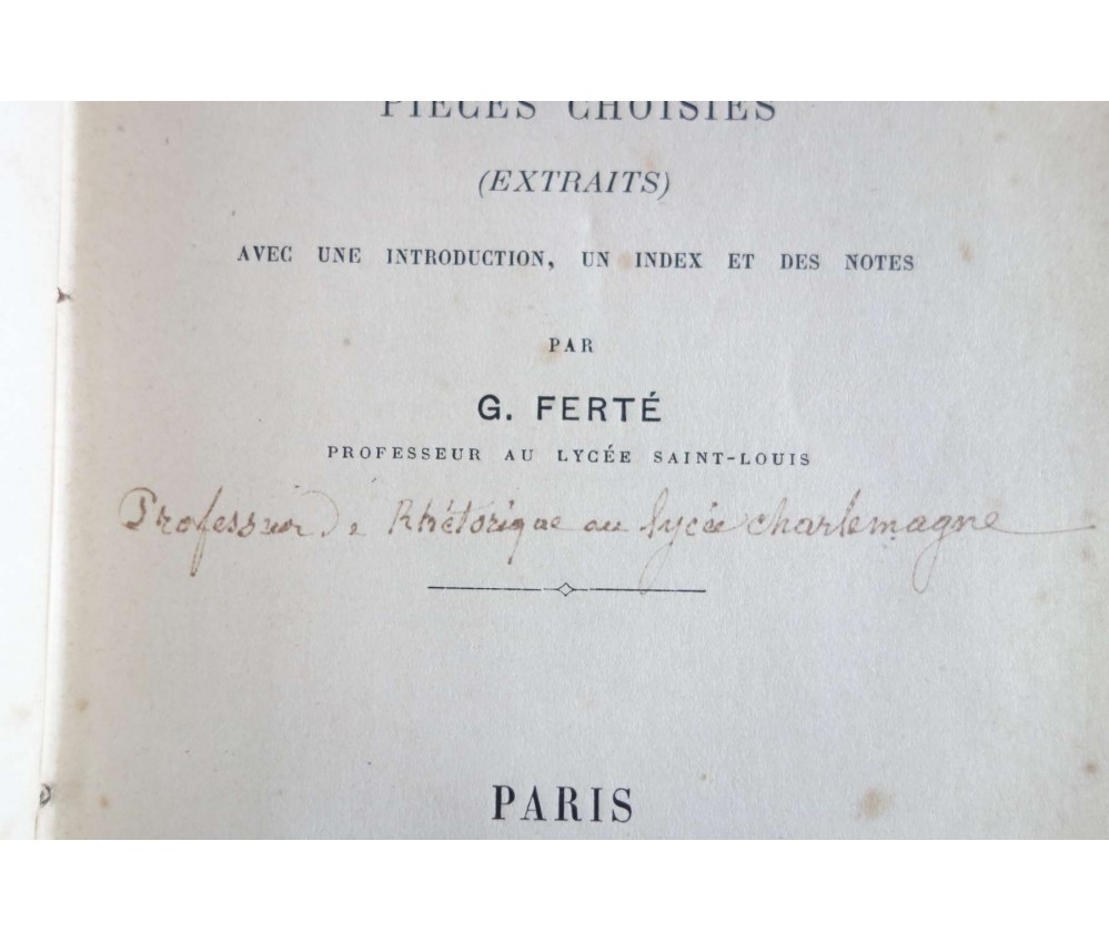 Voir nos visuels, Ed. G. Masson, coll. LANTOINE, sans date, 218 pages, relié, avec une dédicace de l'auteur. Pièces choisies (extraits) avec une introduction, un index et des notes par G. Ferté. Livre en bon état, mais intérieur jauni avec des rousseurs. Couverture avec petite usure des bords et coins. Nombreux livres de théâtre et scolaires en stock dans notre librairie. Envoi rapide et soigné! (S1)